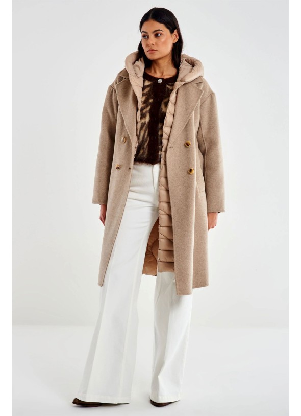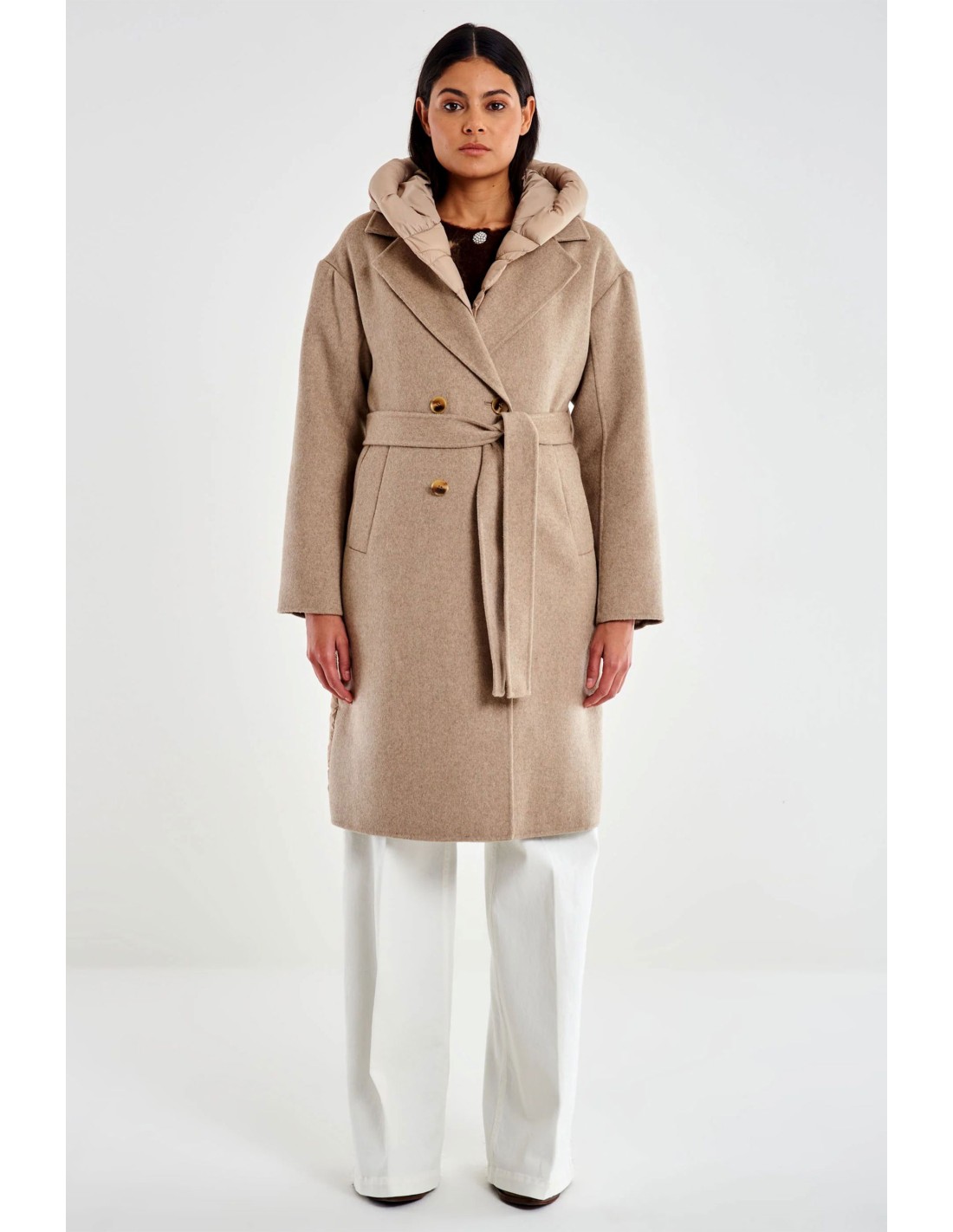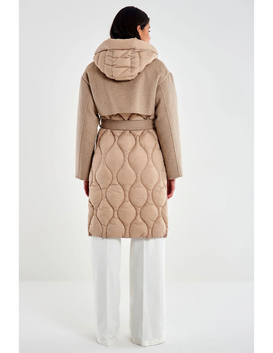 Abrigo midi con cinturón y detalles de tejido combinado en la parte delantera y las mangas. Capucha con relleno de plumón en la espalda y en el interior. Cierre frontal cruzado con solapas y botones de carey con cinturón. Bolsillos ribeteados.