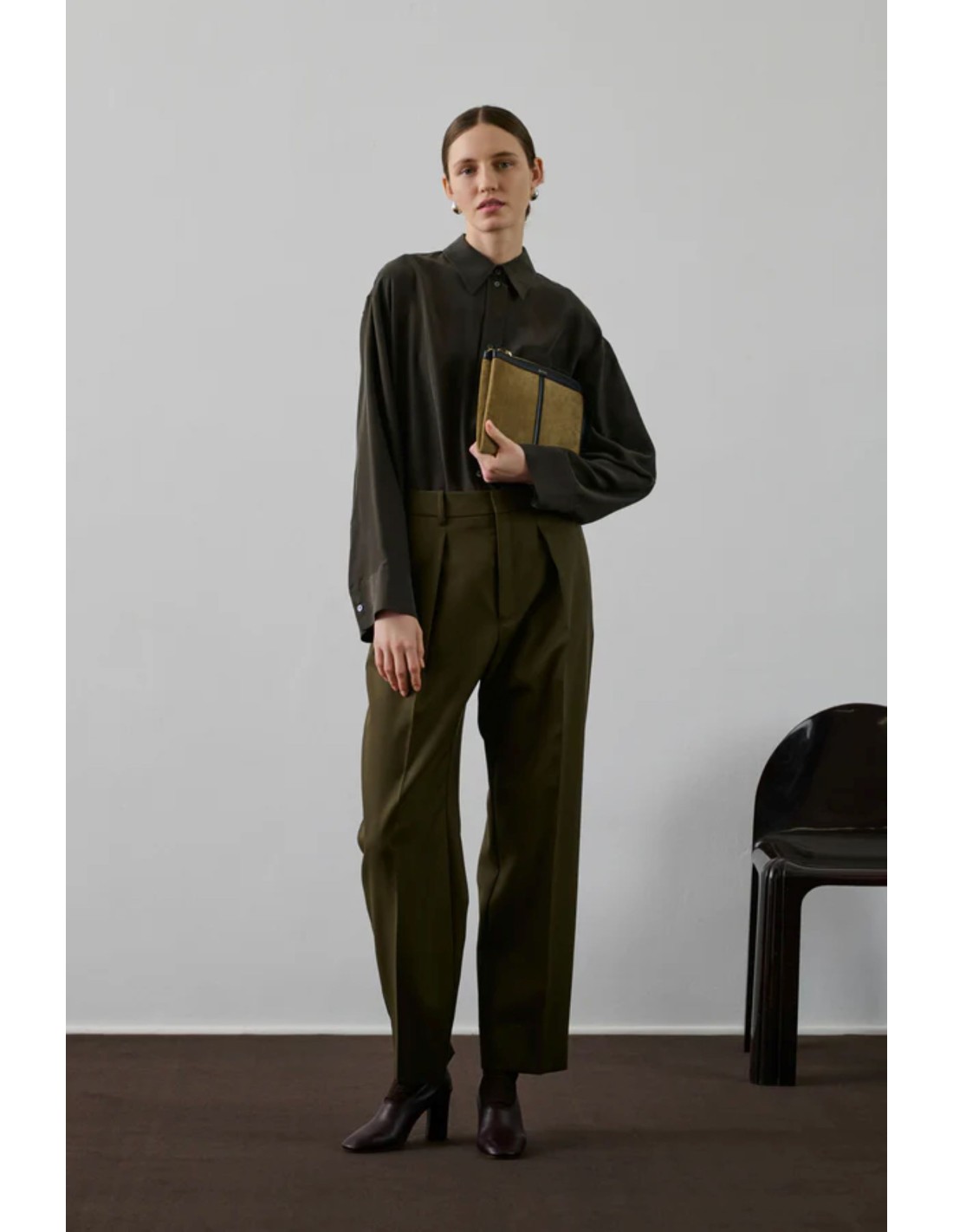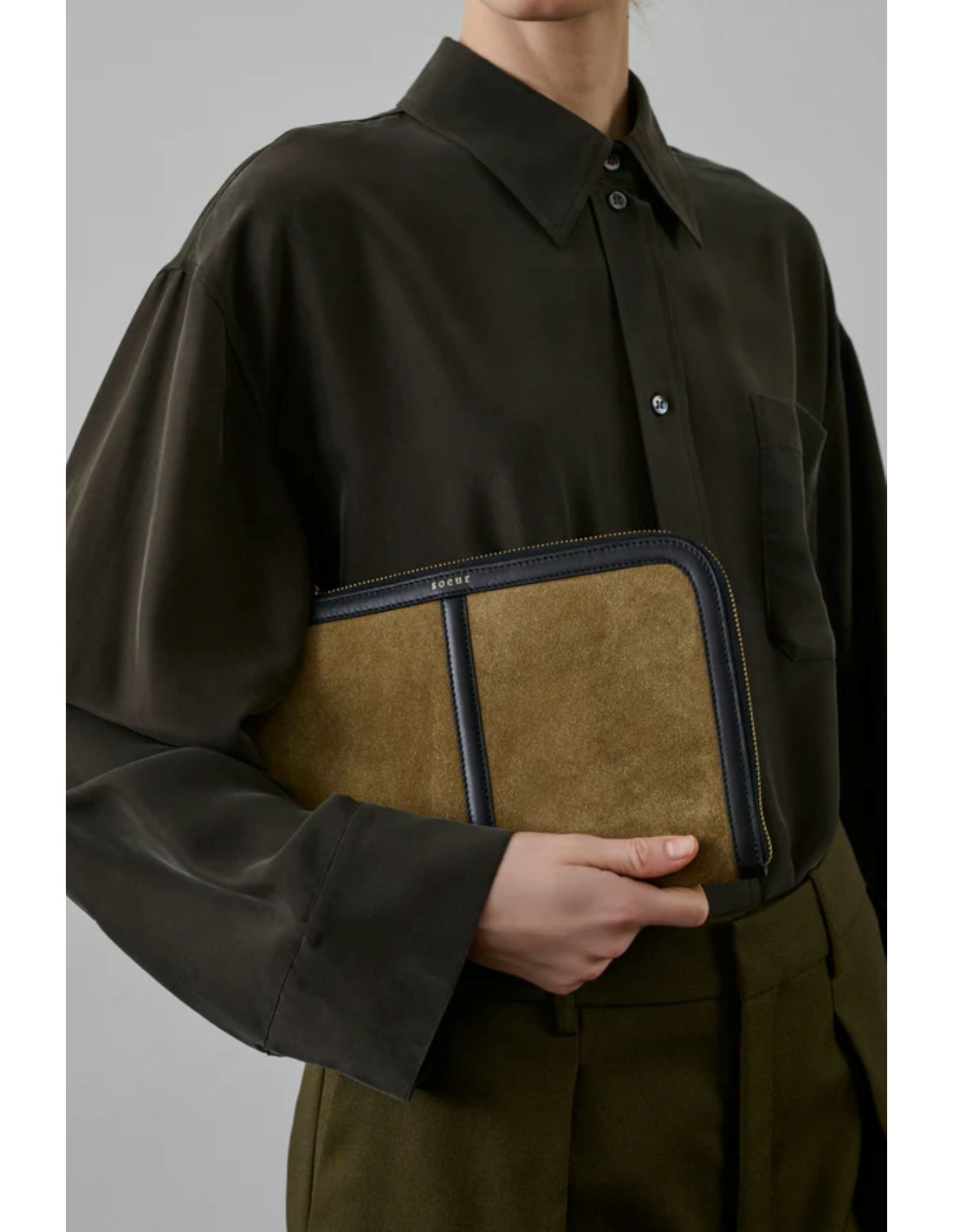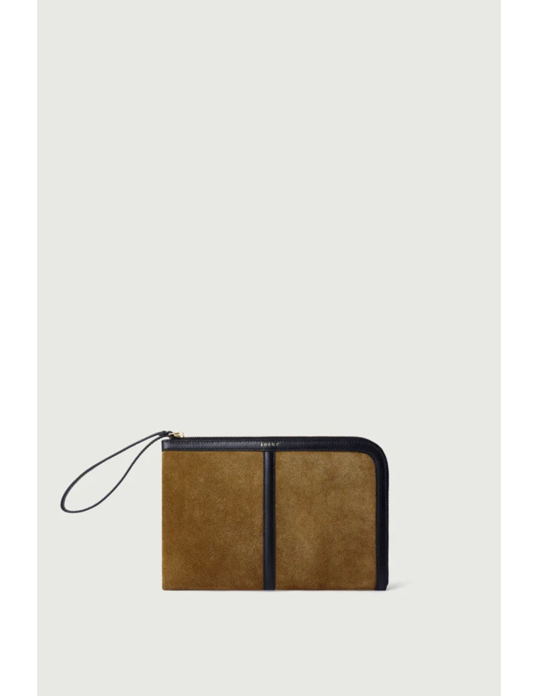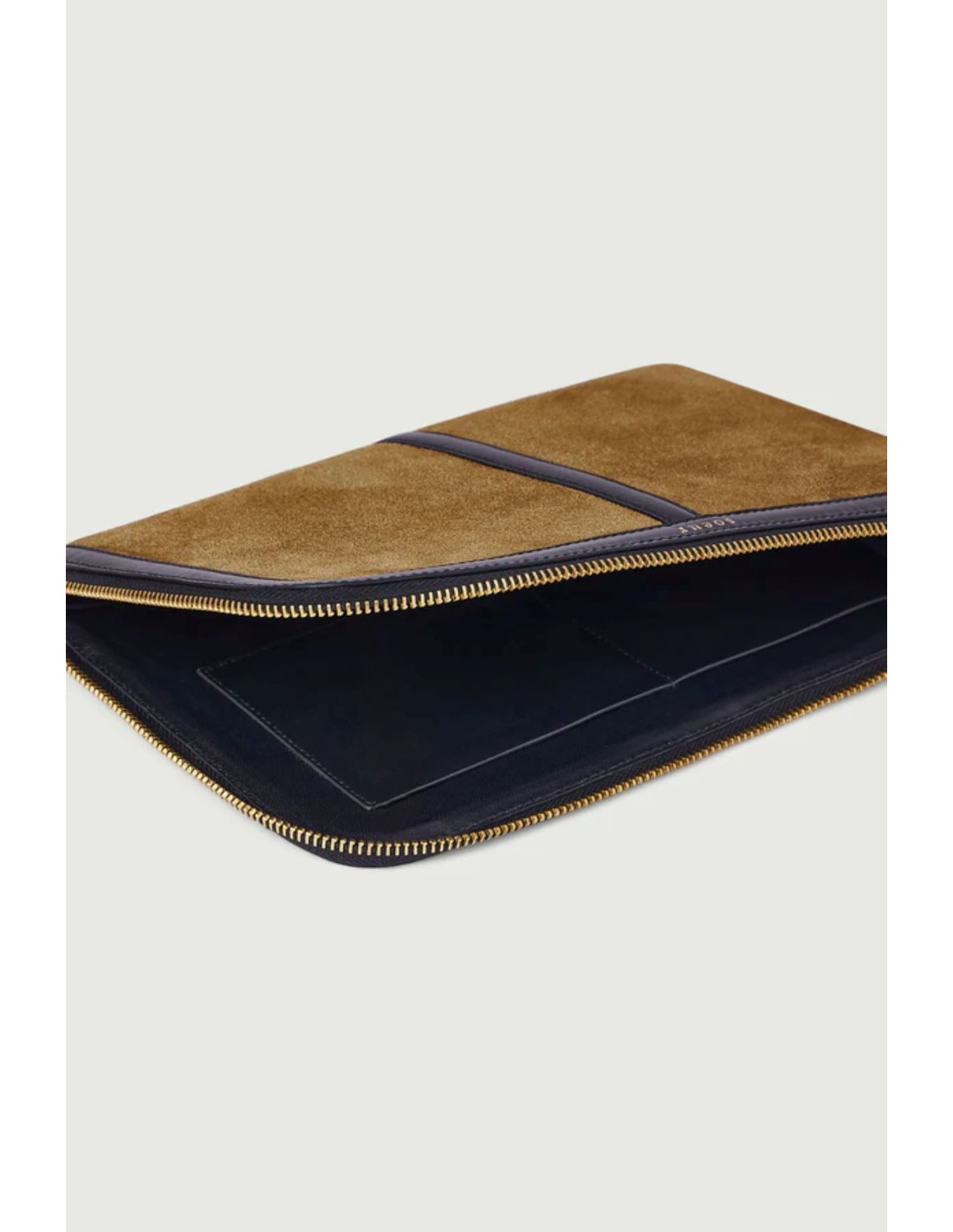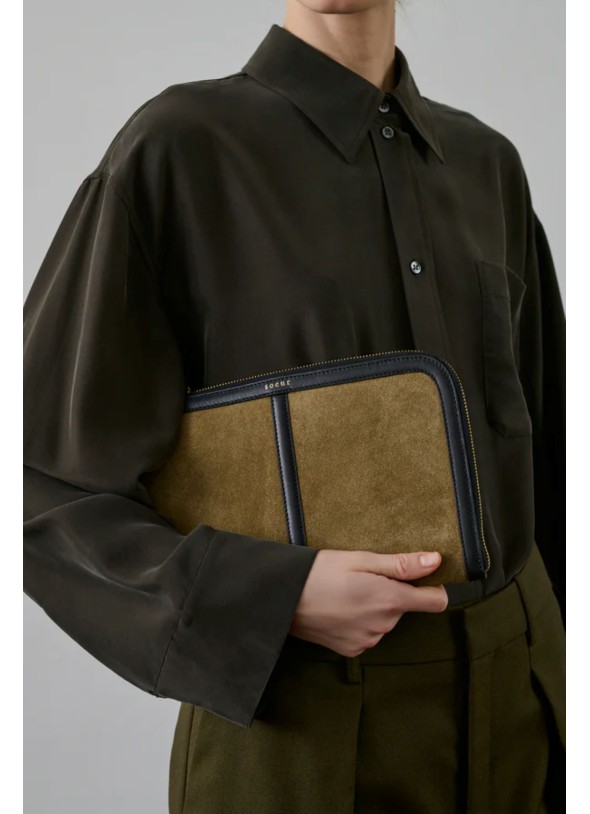 Cartera de cuero napa bronce y cuero liso negro con forro de cordero.