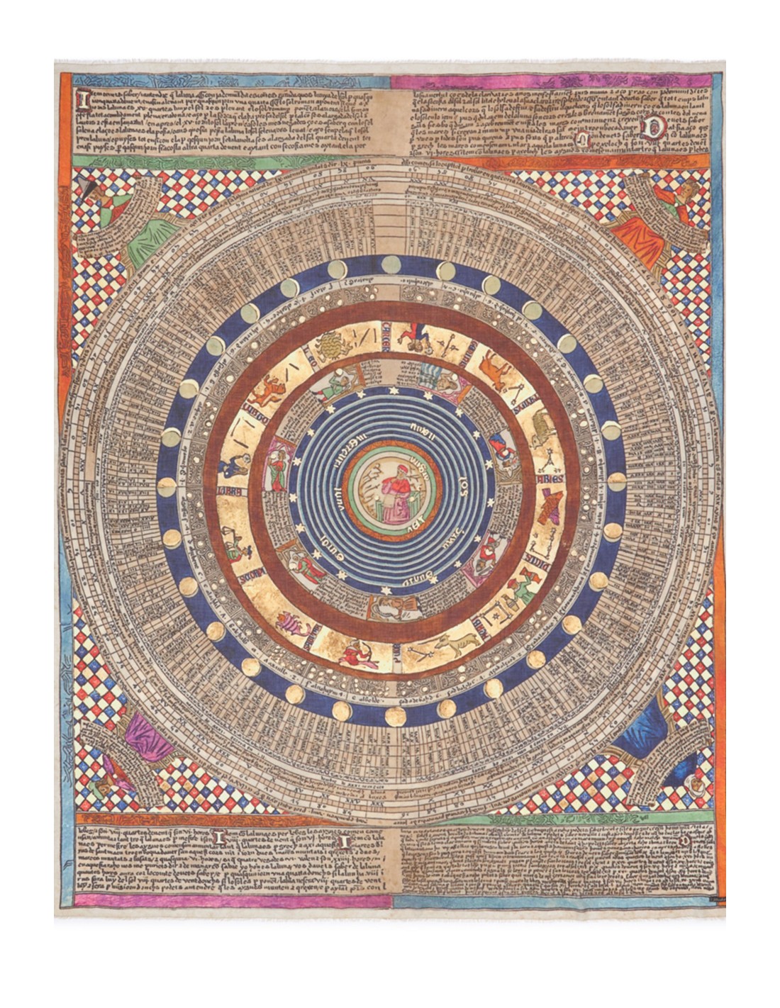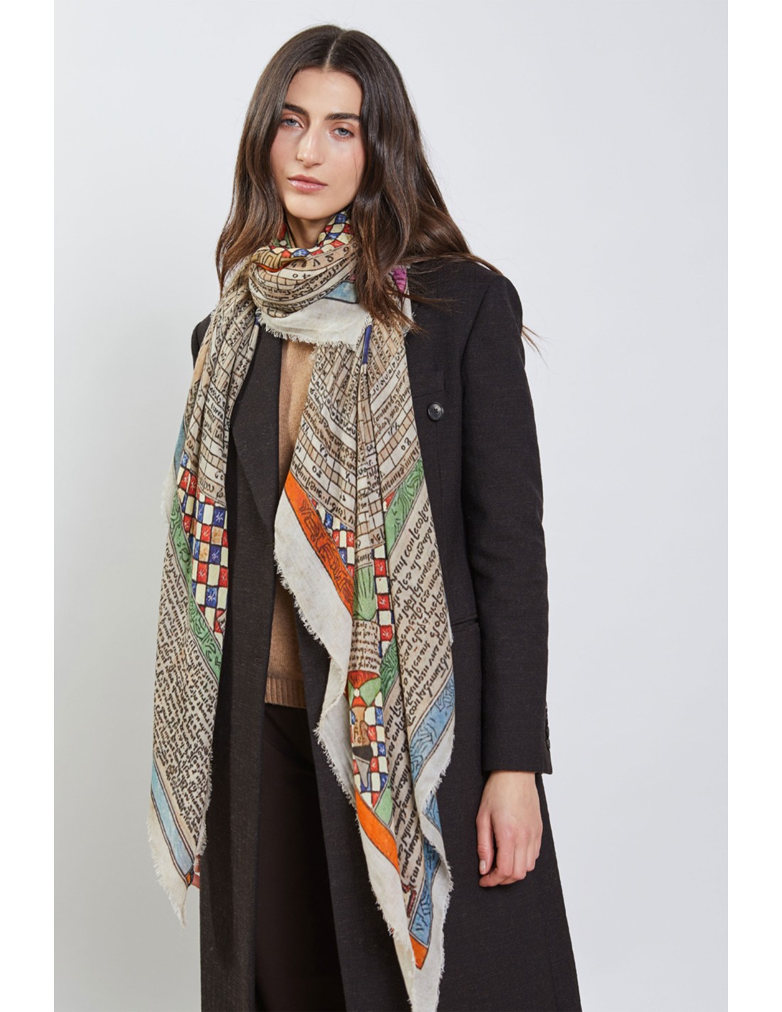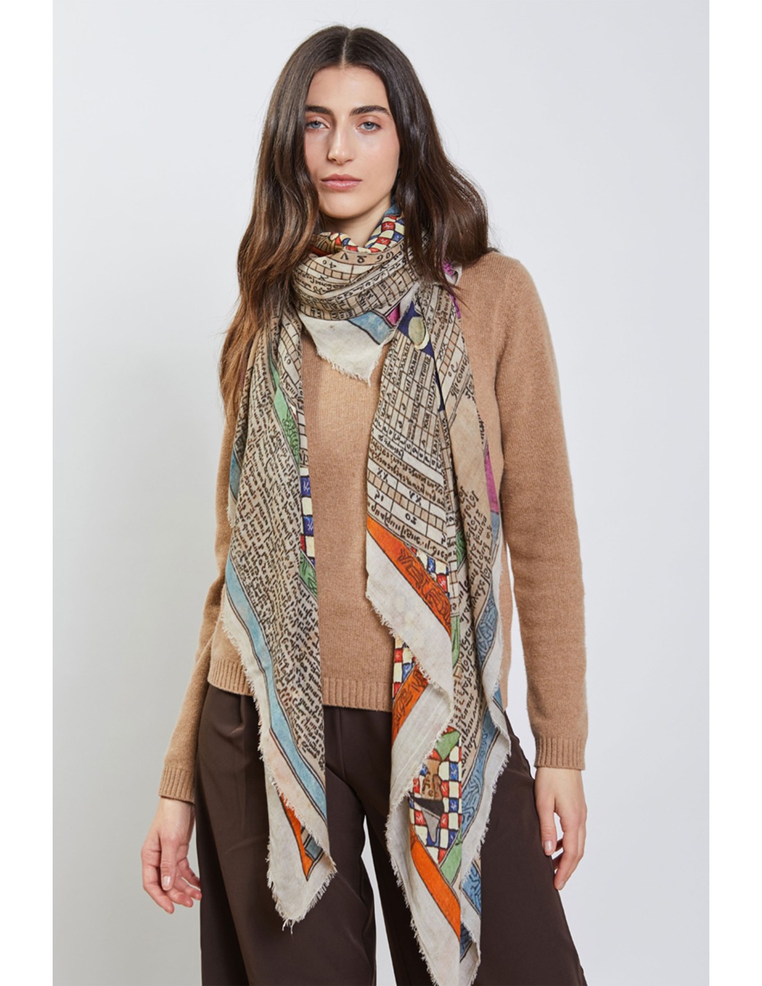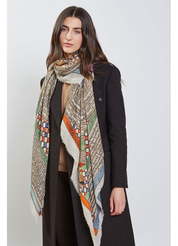 Estola con estampado geométrico circular en tonos neutros, tiene una base de modal y cachemira