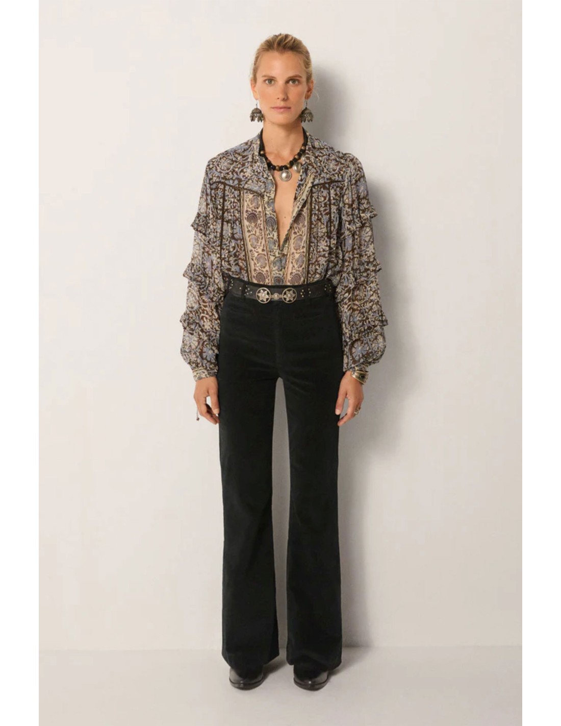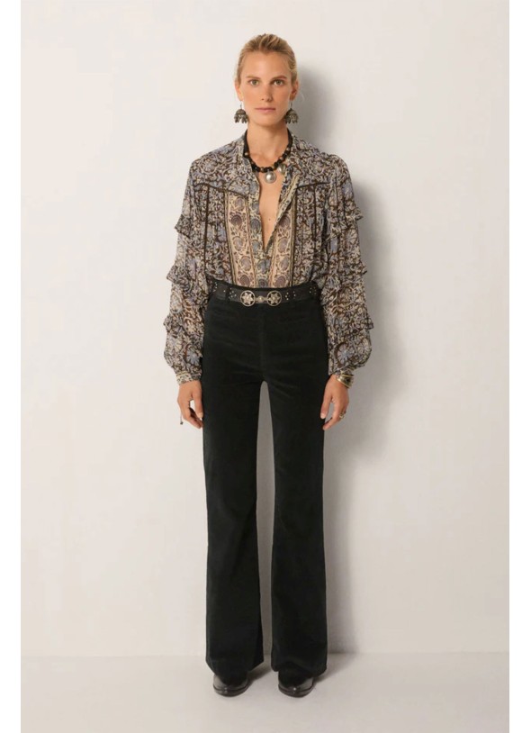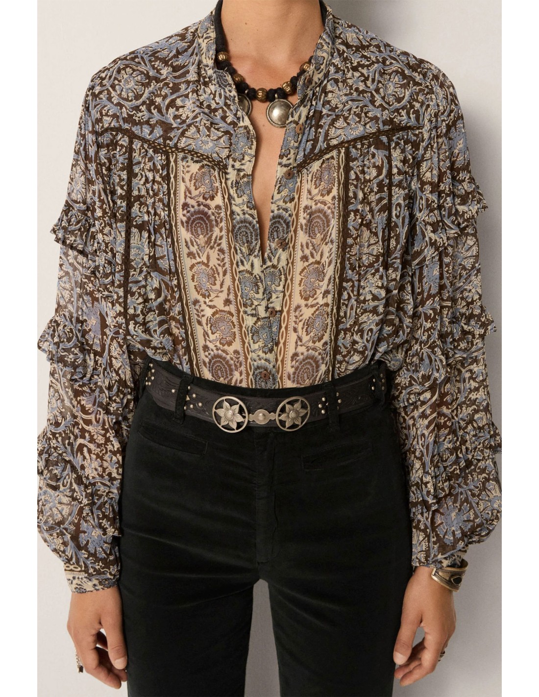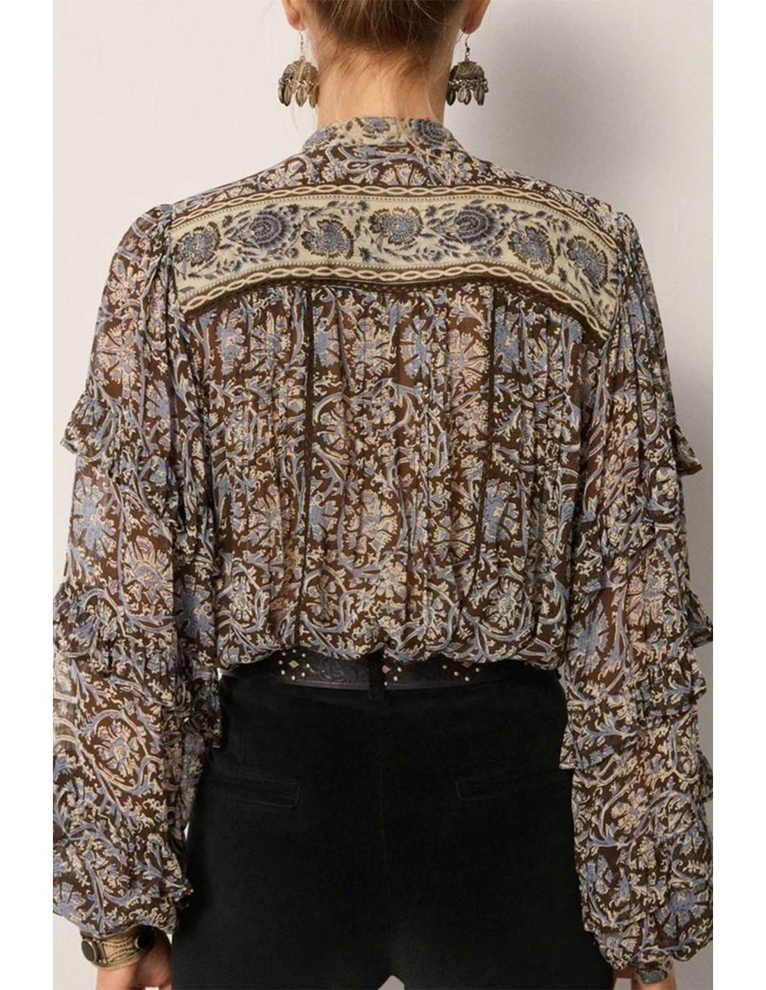 Camisa viscosa de corte amplio estampado floral, cuello redondo, detalle de tres volantes en las mangas.