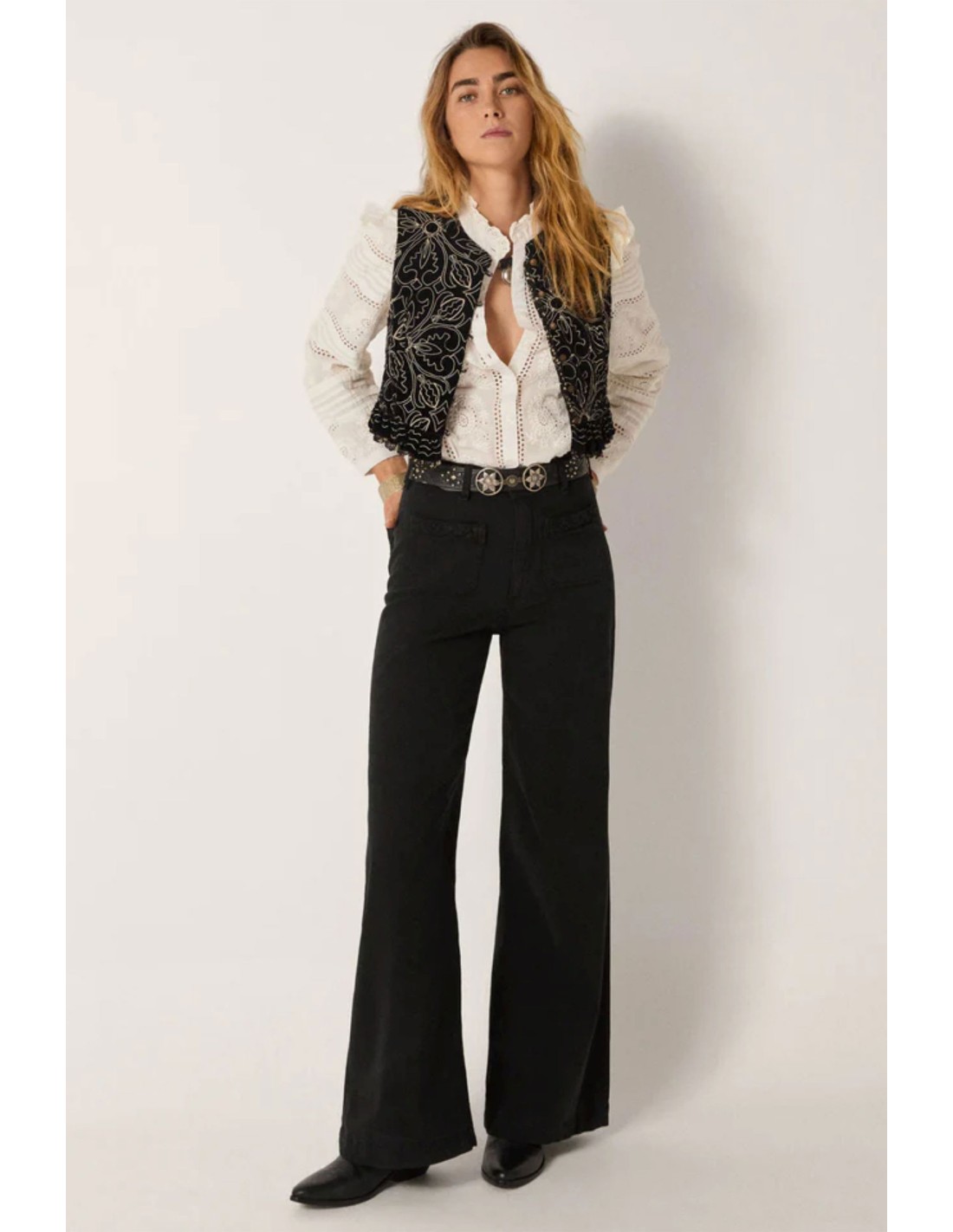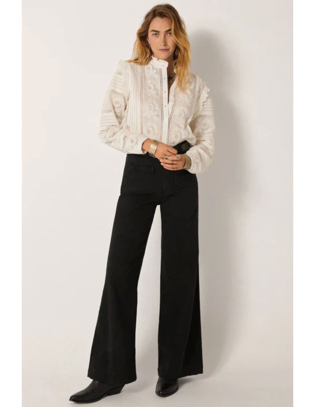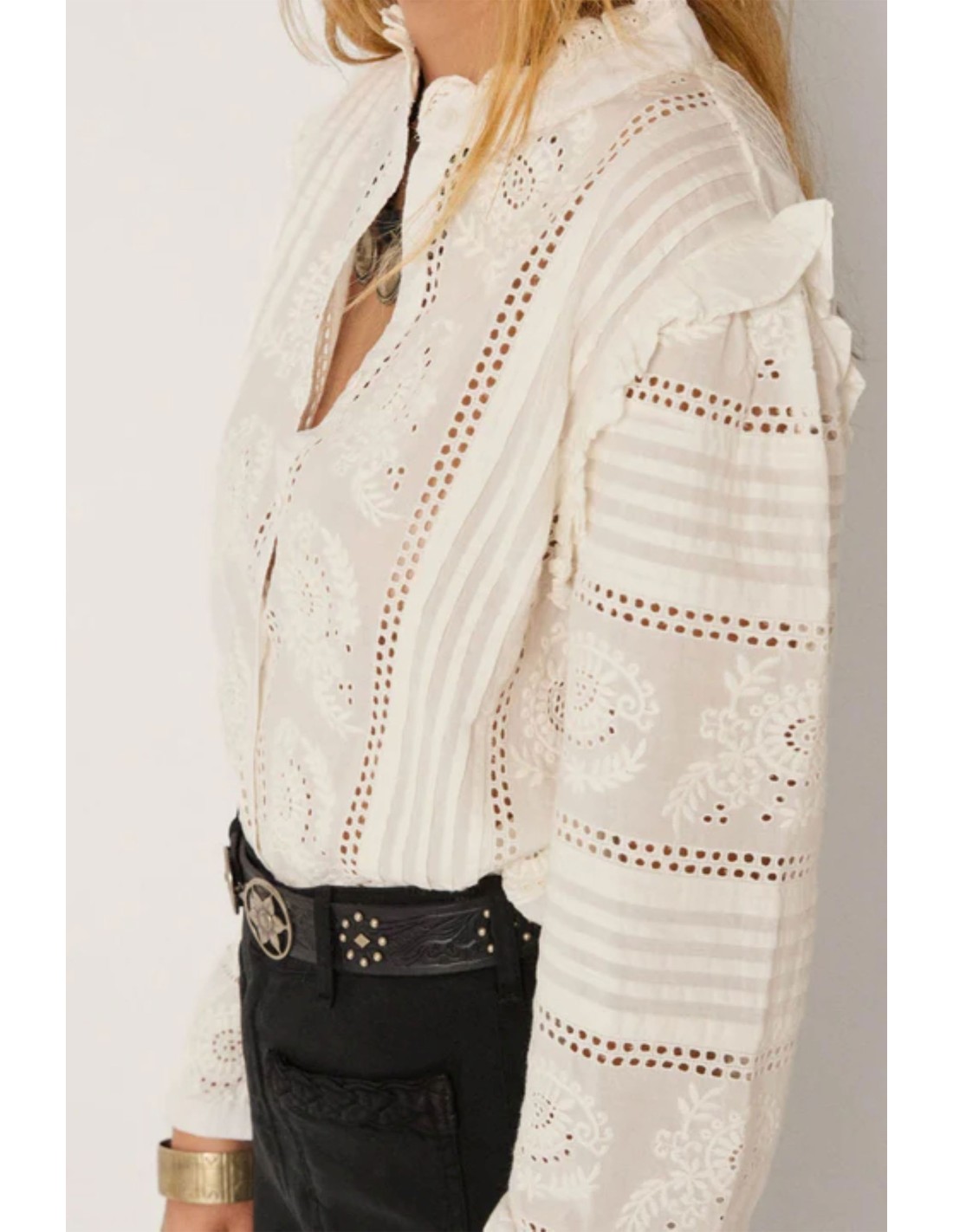 Camisa romántica en algodón vaporoso y ligero, un intrincado bordado de ojales recorre toda la prenda, pliegues y detalles definen la silueta