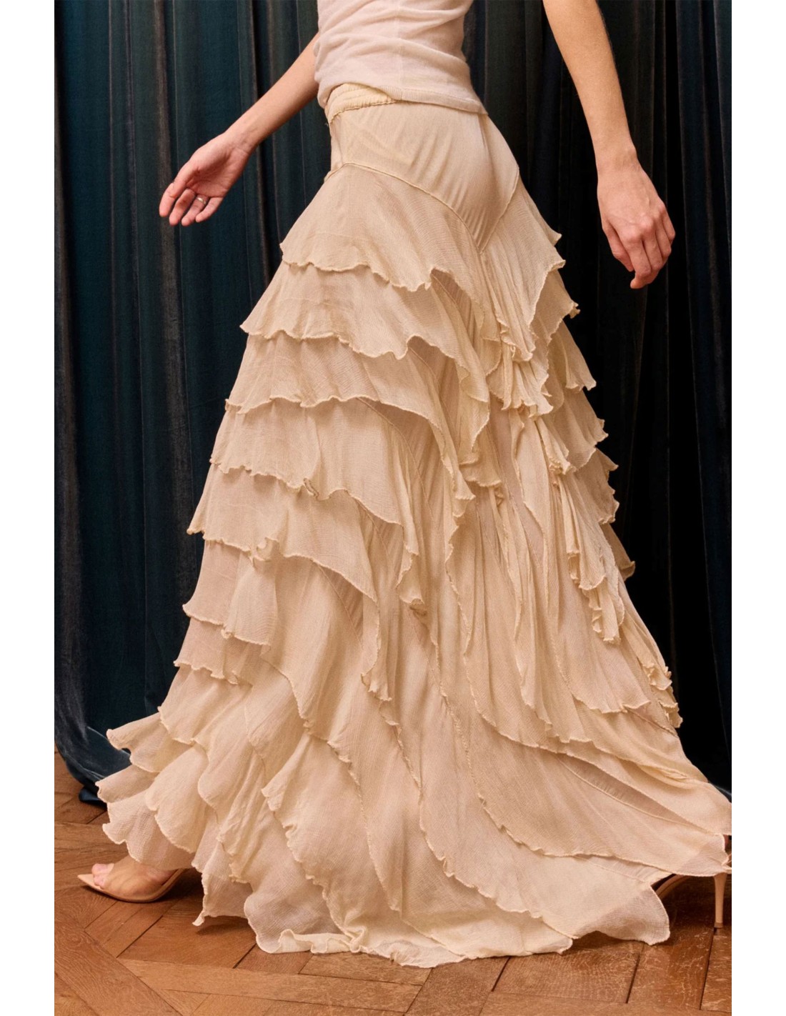 Falda en gasa de viscosa en color crudo consta de volantes asimétricos seda creando movimiento, cintura elástica