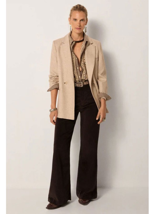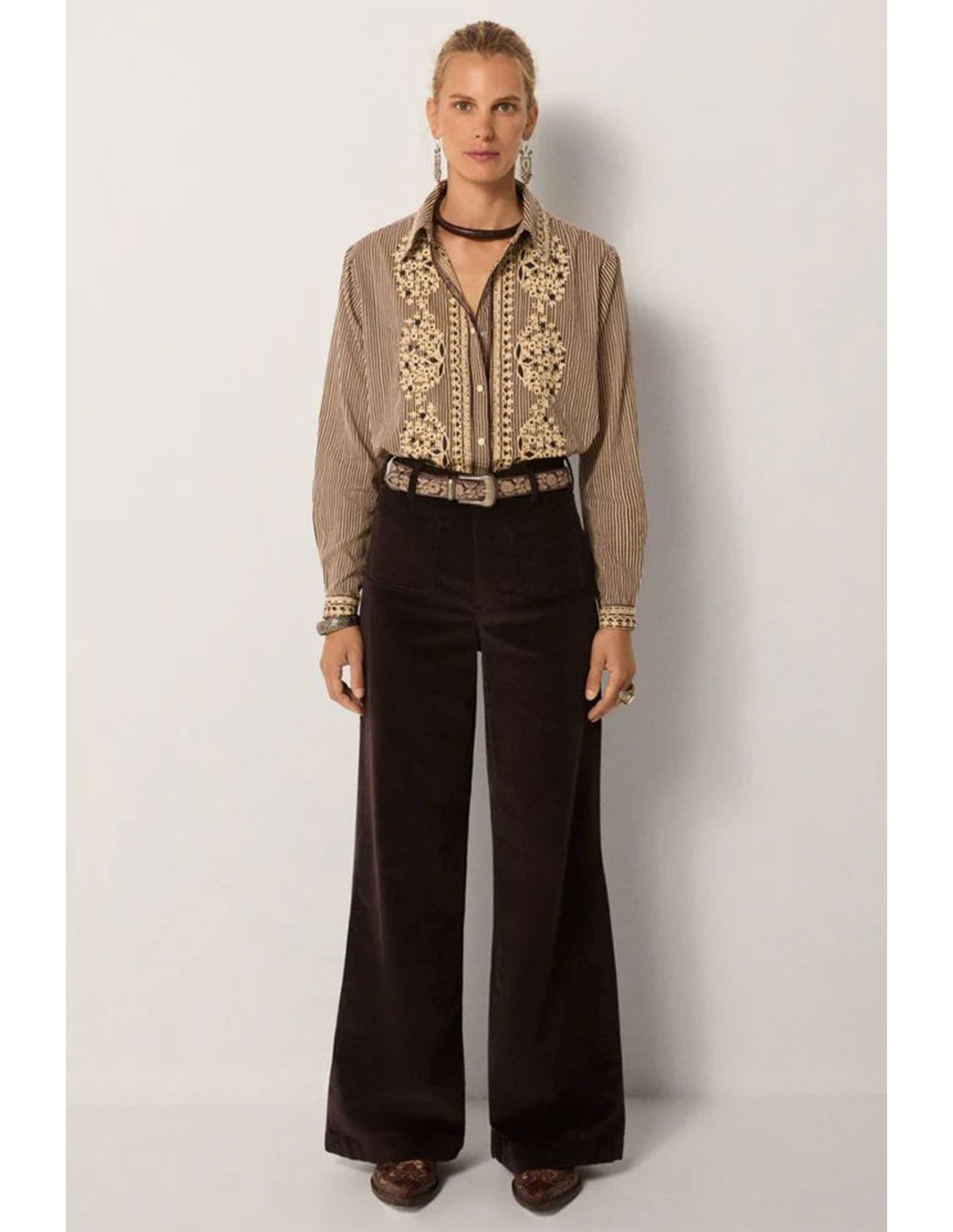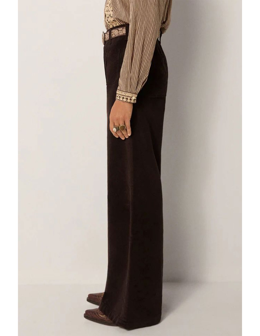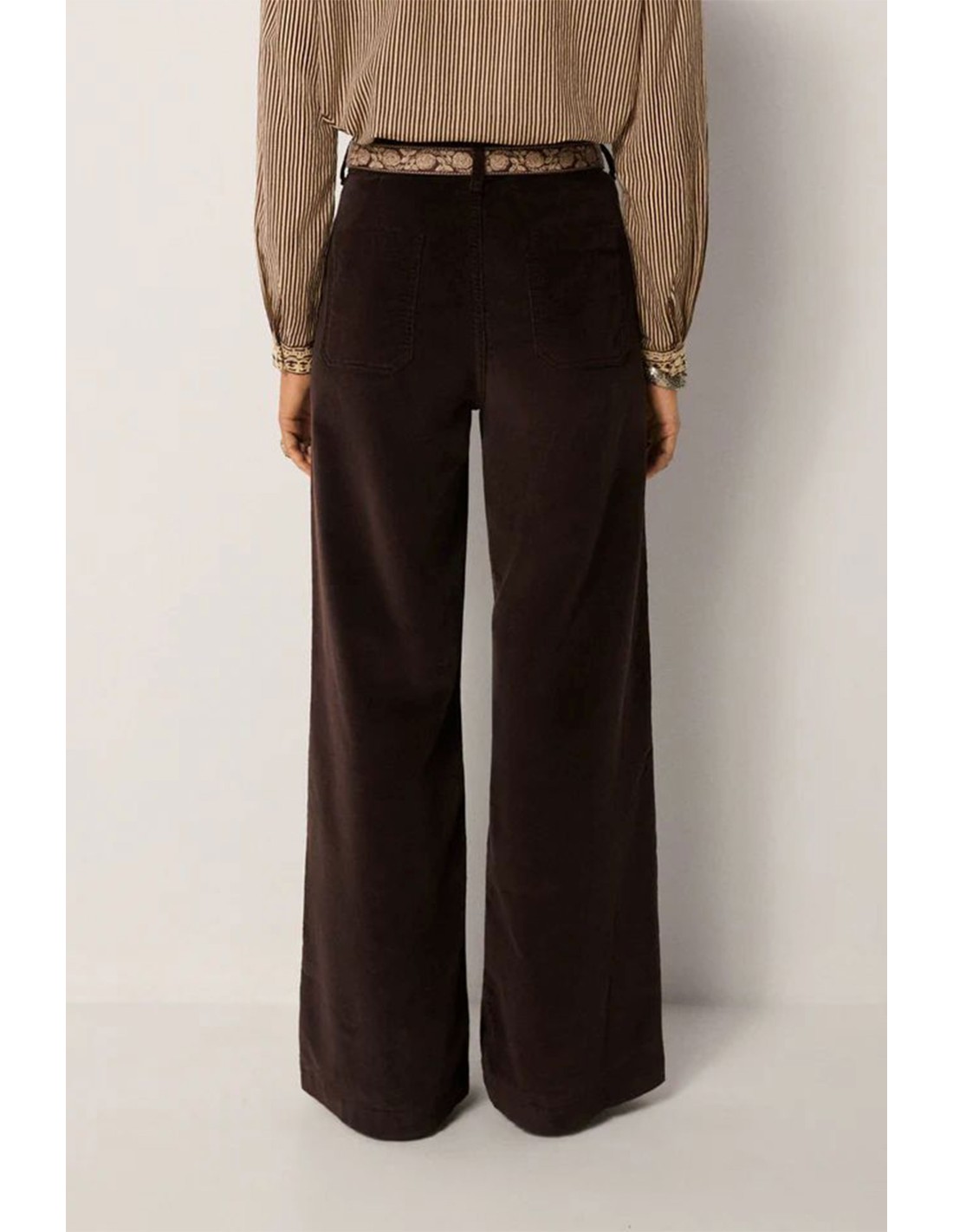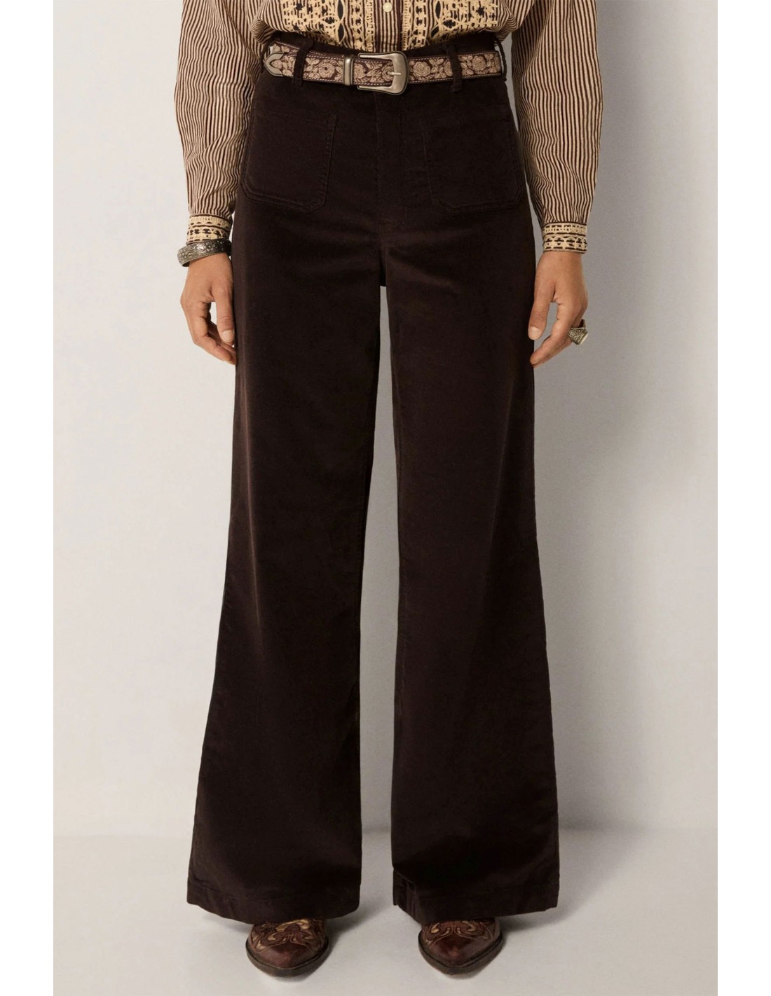 Pantalón de pana fina en color marrón. bolsillos plastones delanteros, cintura alta y pierna acampanadas