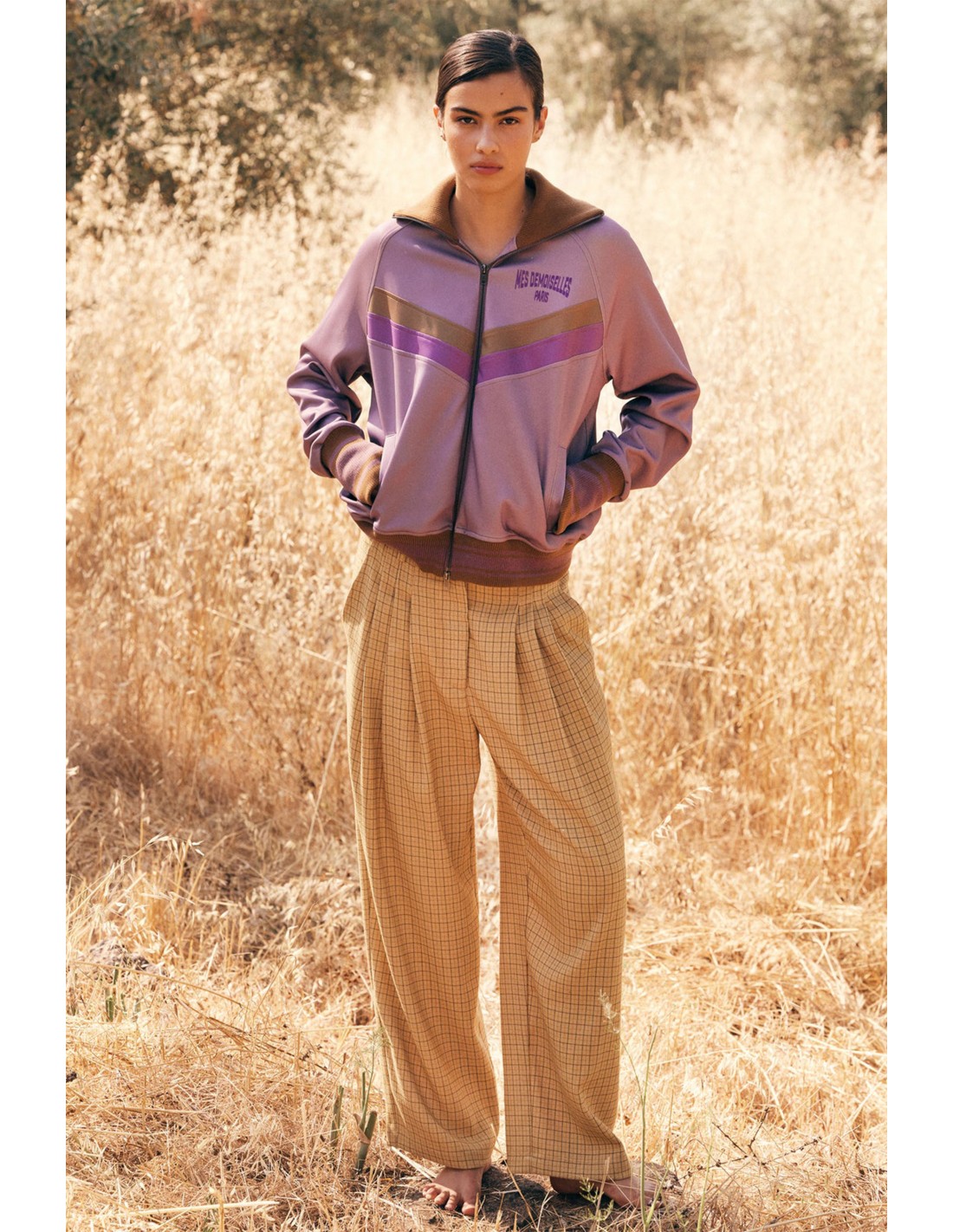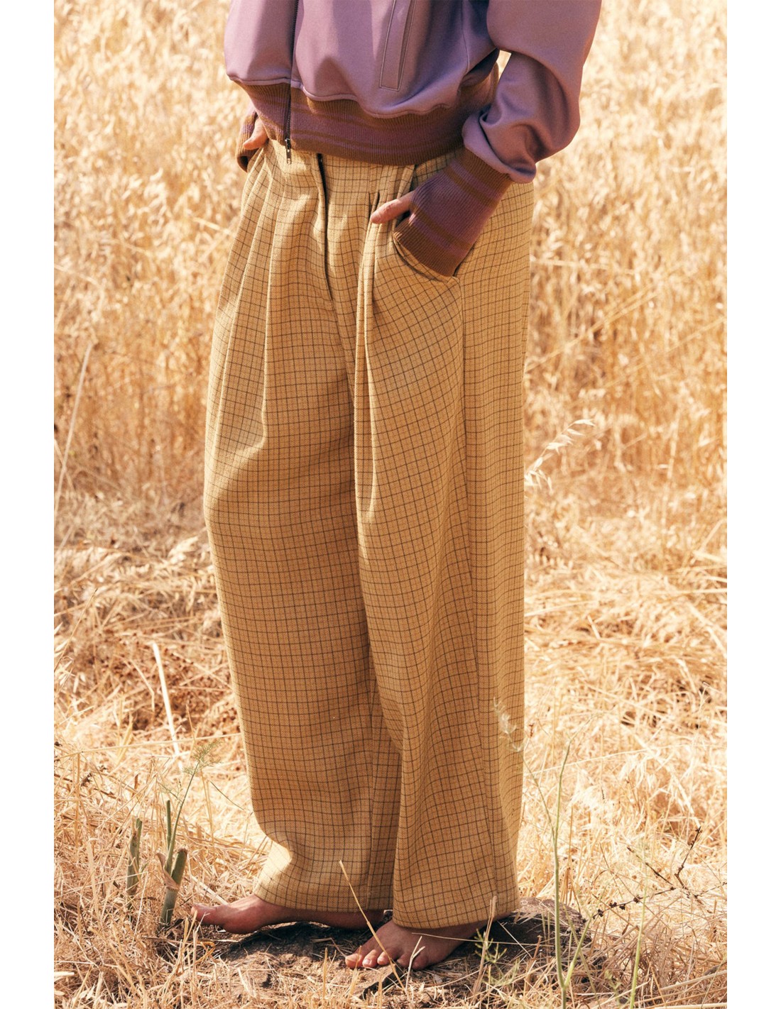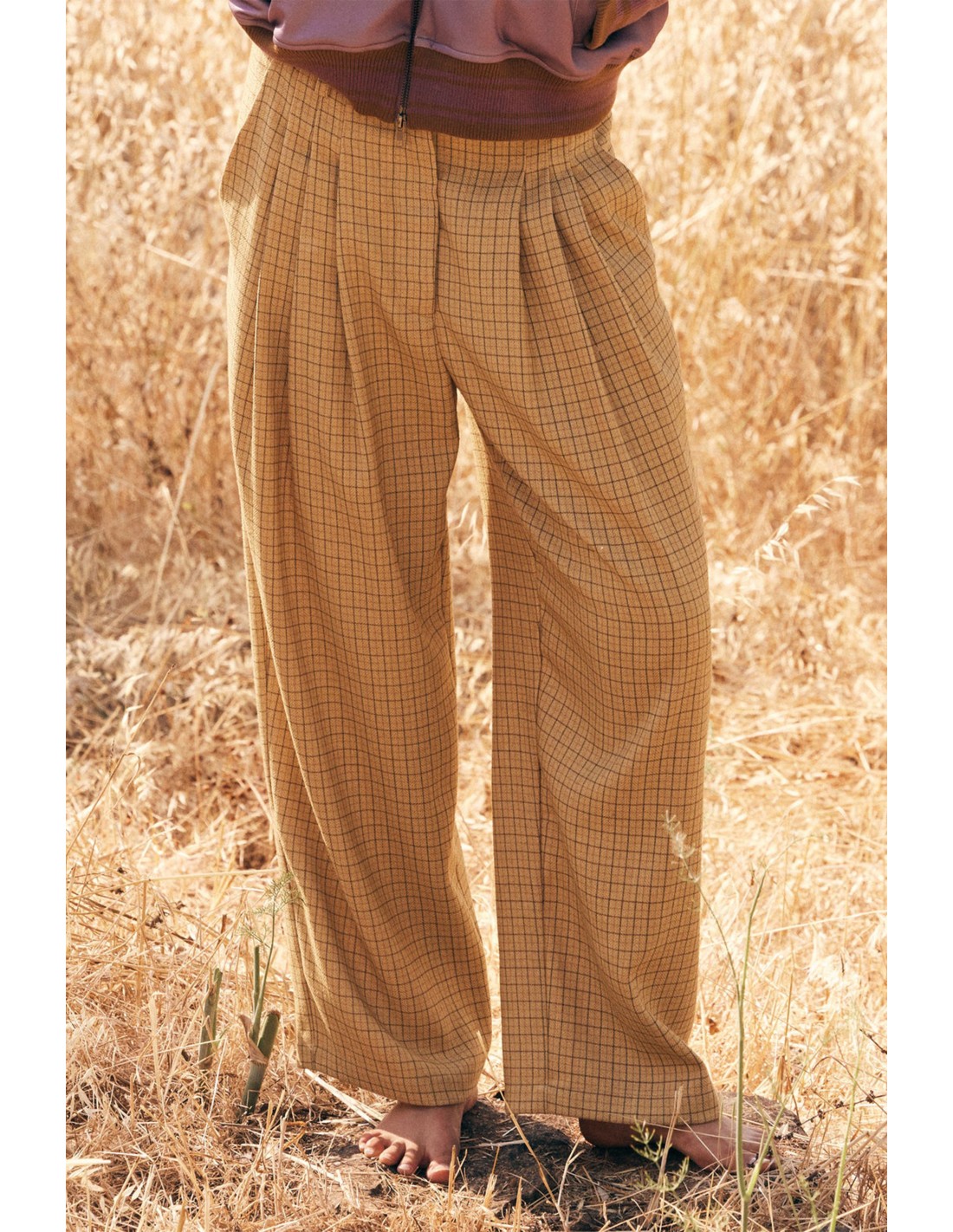 Pantalón con pinzas delanteras de tejido de cuadros ingleses en amarillo paja,  corte amplio y fluido, con bolsillos laterales y trabillas.