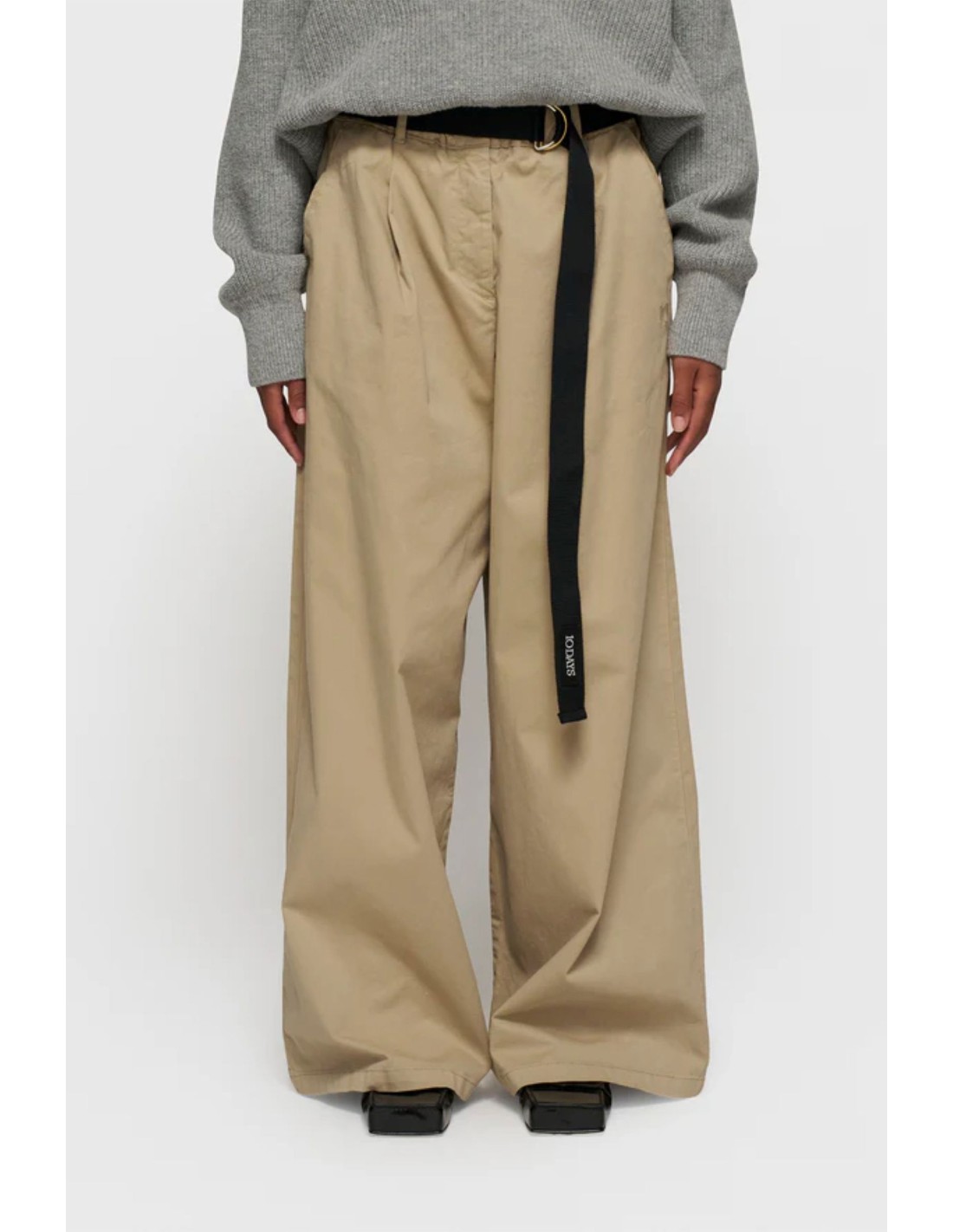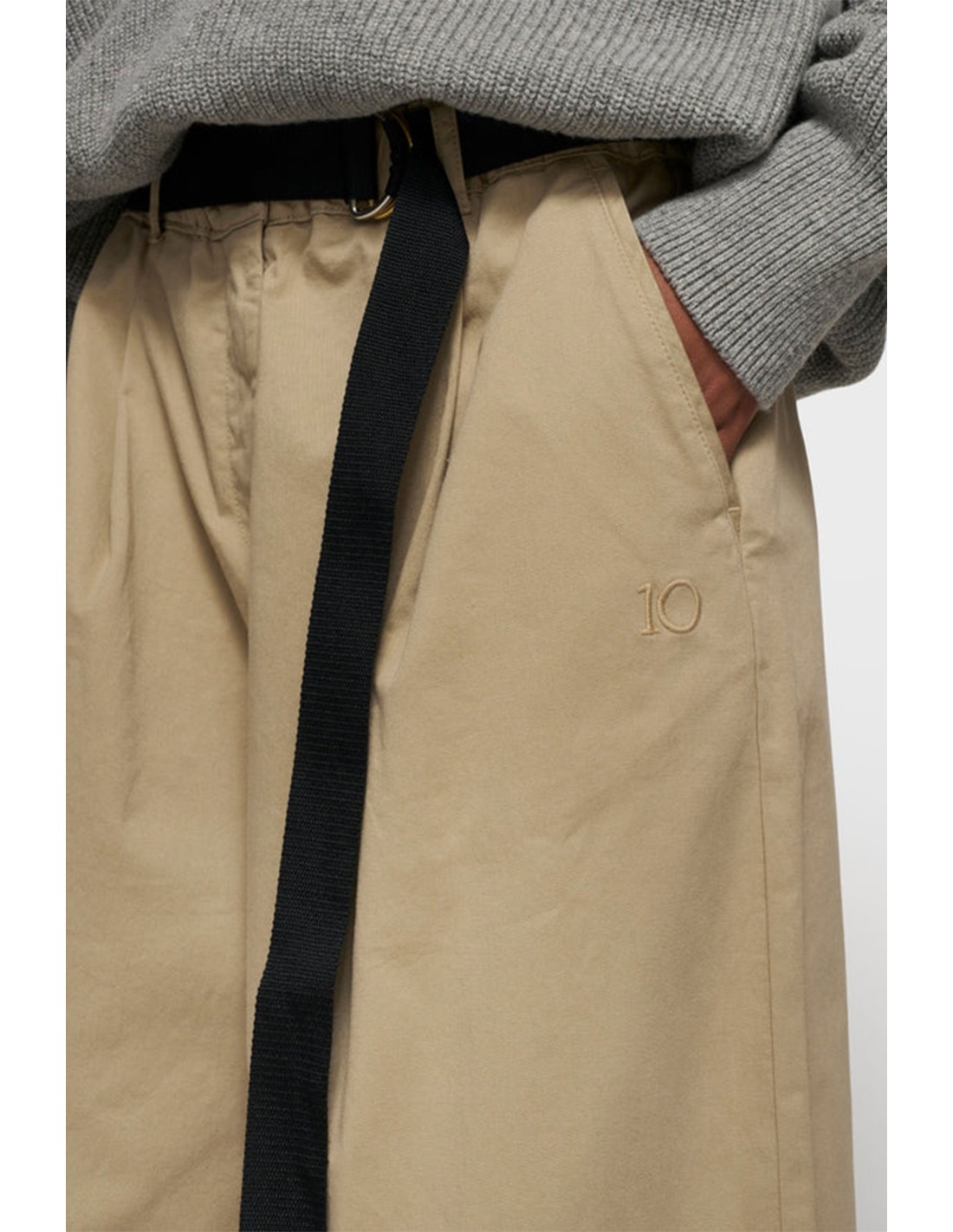 Pantalón de corte regular con pernera ancha, confeccionados en algodón orgánico ,diseñados con cinturilla elástica y cinturón de algodón,  bolsillos delanteros inclinados y monograma de la marca bordado debajo del bolsillo.
