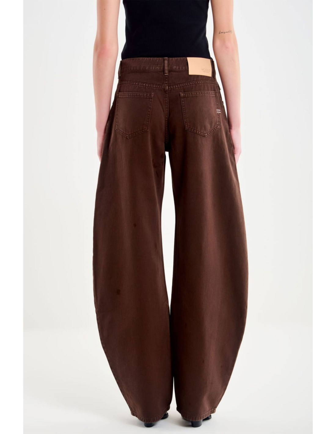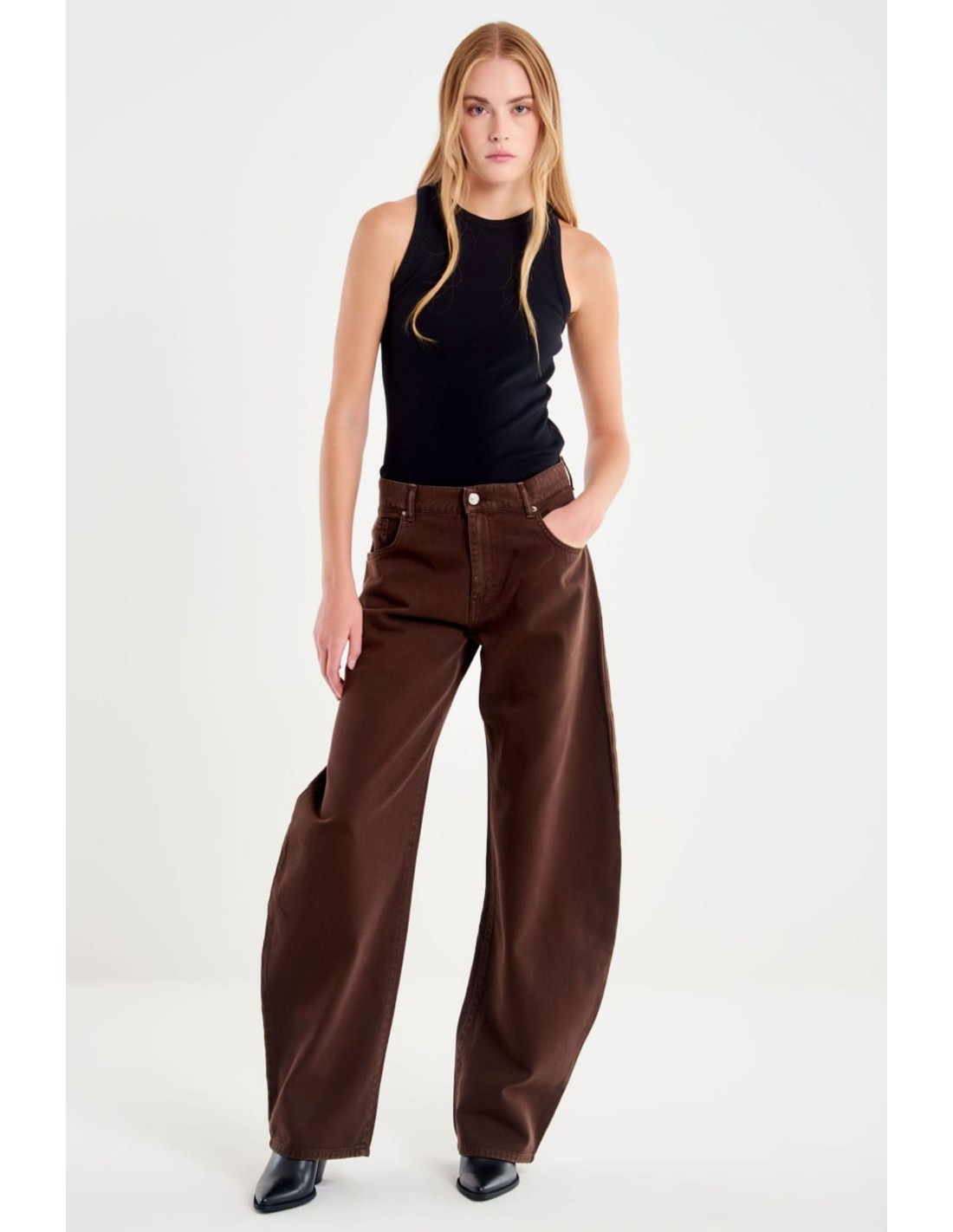 Pantalón vaquero ancho en color marrón chocolate, corte barril, cierre frontal y botón metálico, piernas con efecto globo.