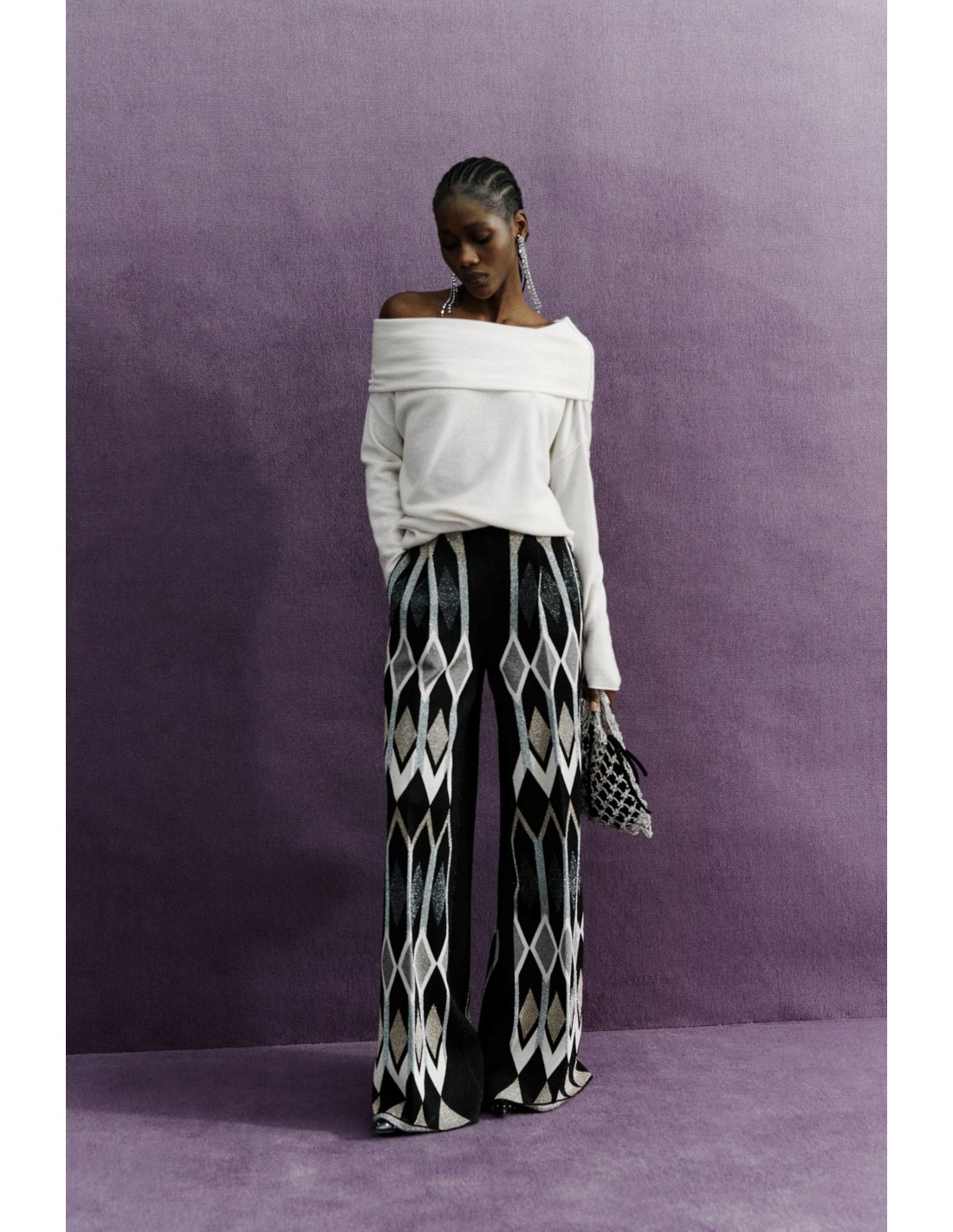 Pantalón punto ancho de lamé con estampado geométrico,  tiro alto,  cintura elástica en negro
