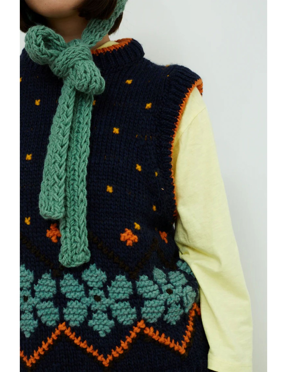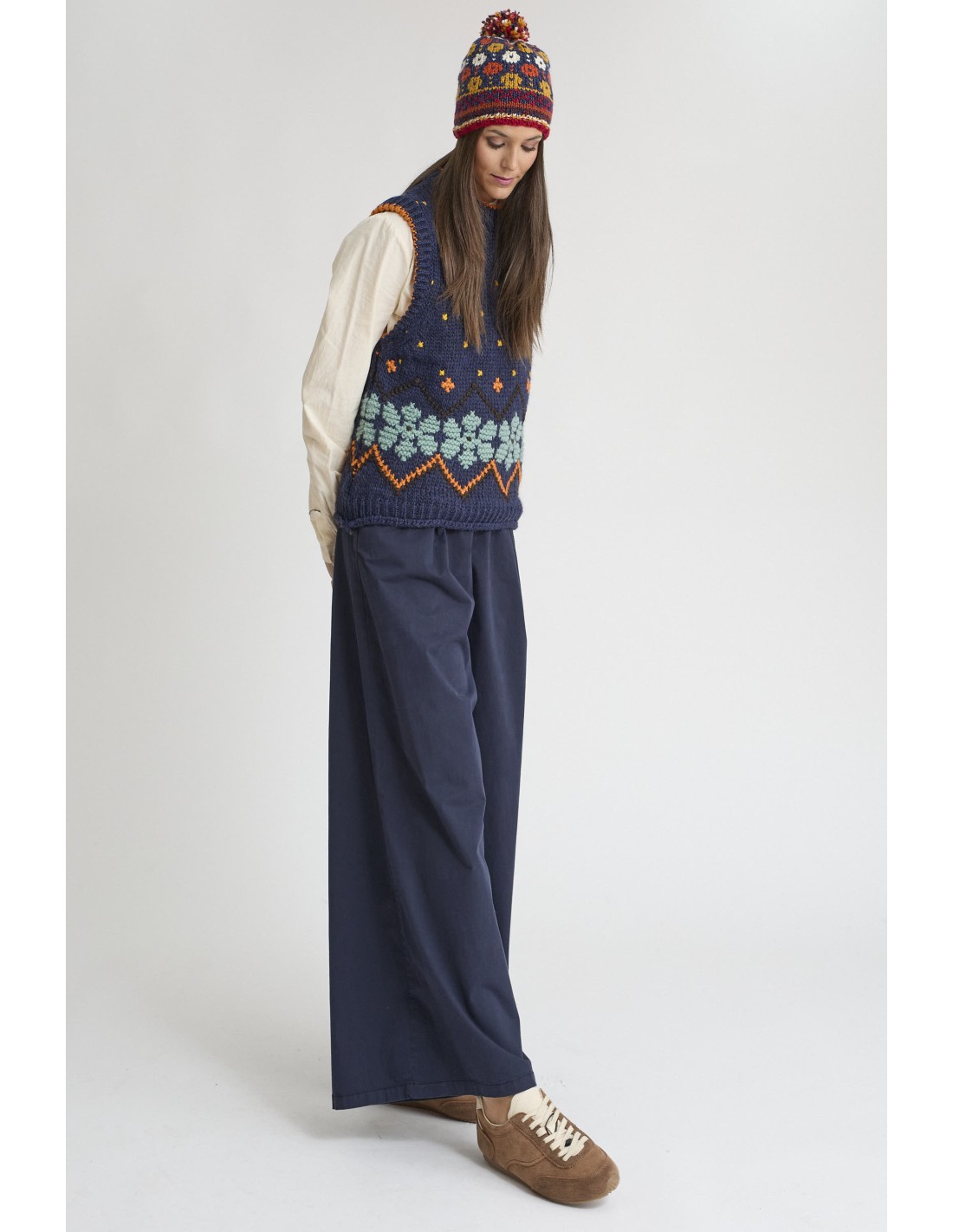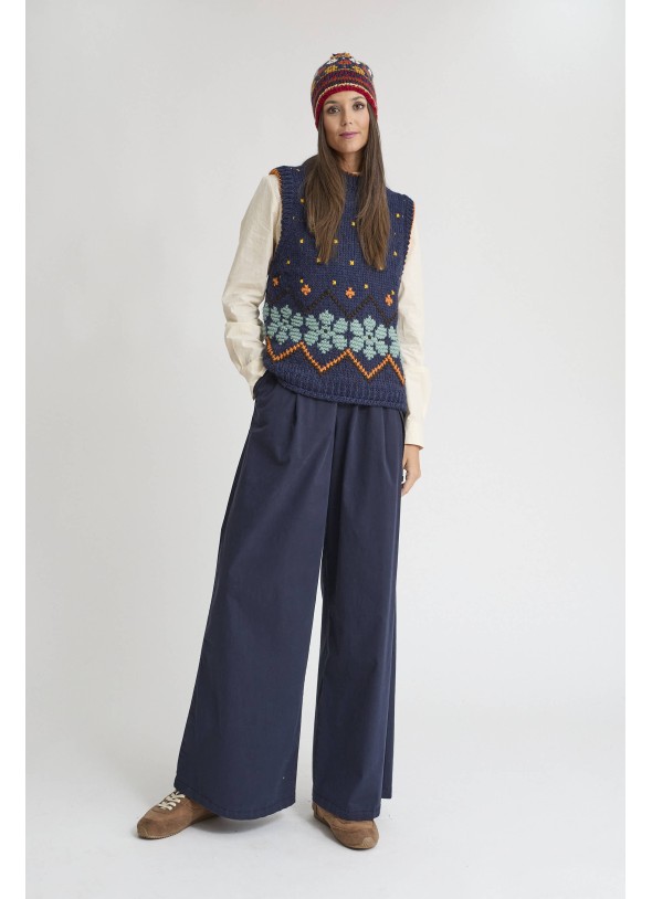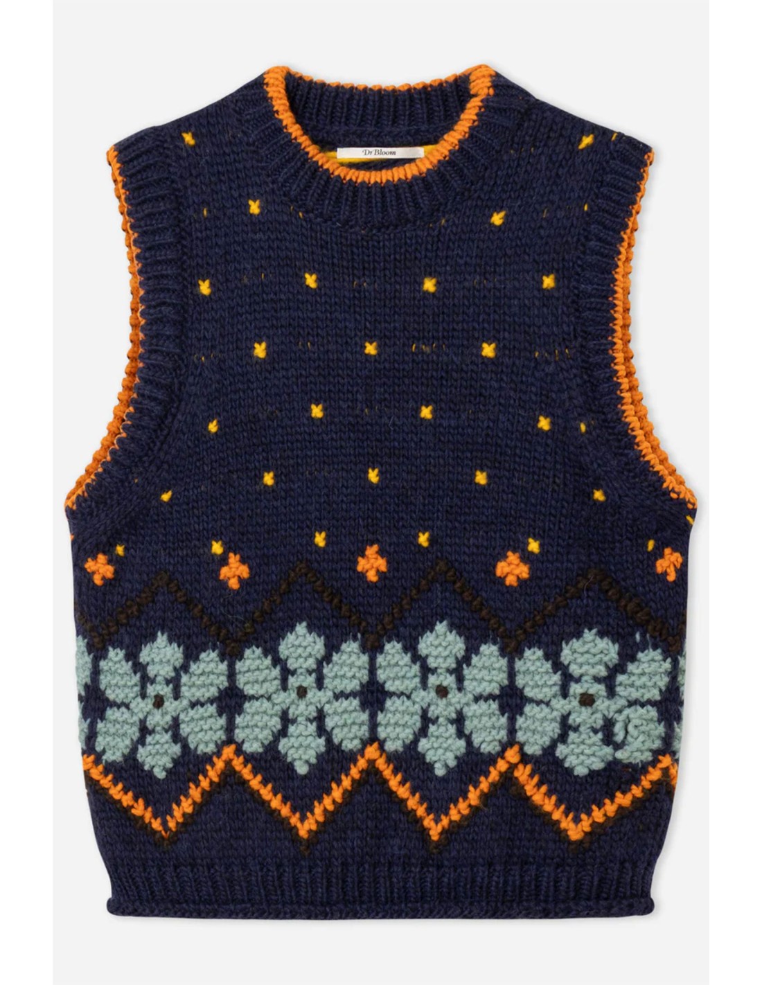 Chaleco de punto color base azul. Textura con dibujo de flores naranja, copos de nieve en azul claro, y zig-zag en marrón y naranja, a contraste. Acabado naranja a contraste en cuello redondo y en sisas