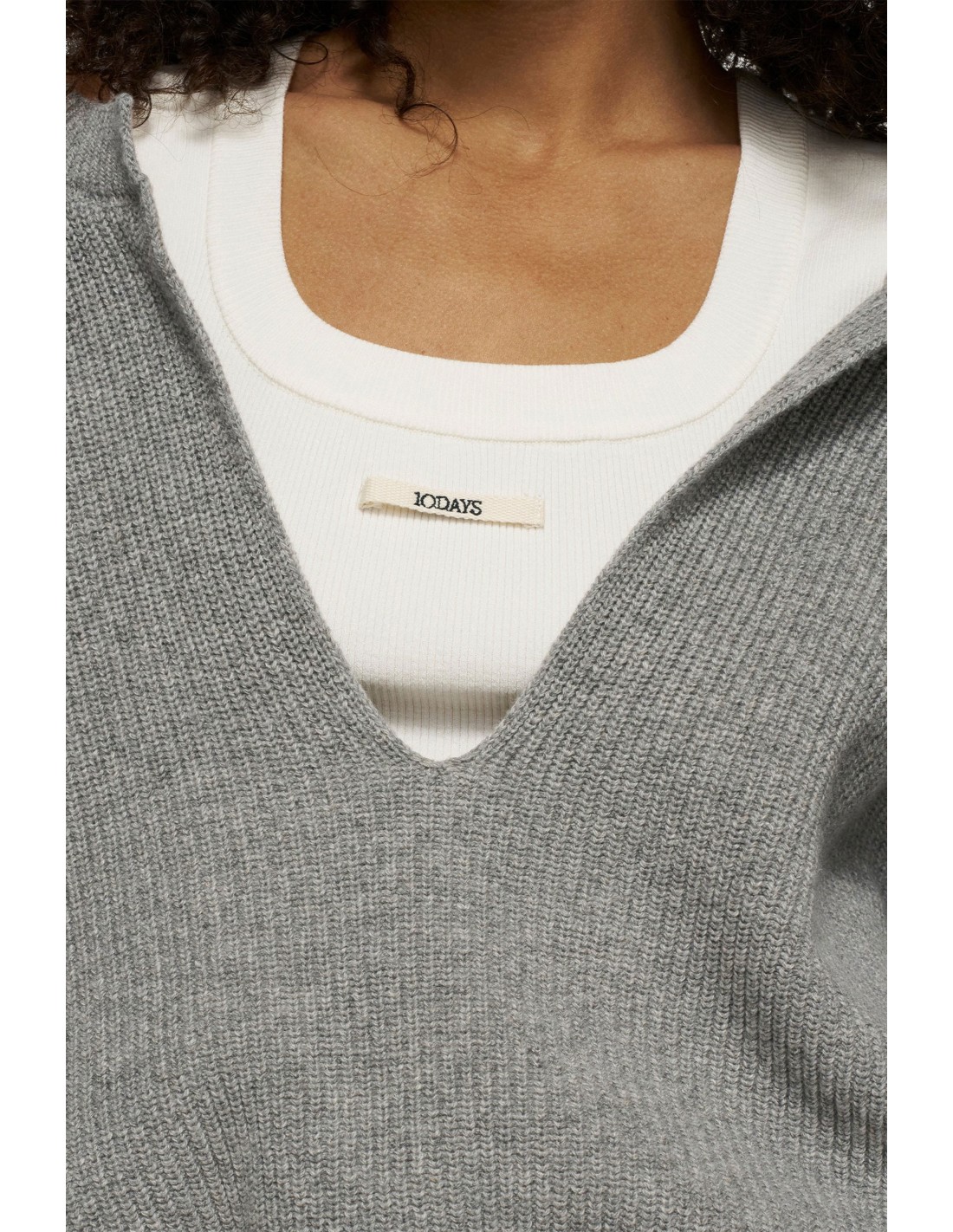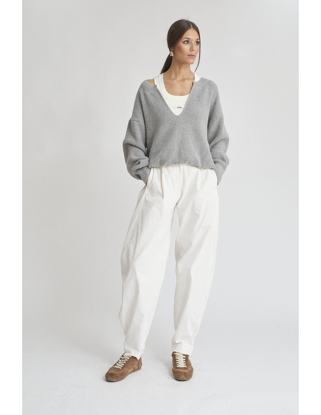 Suéter de punto de cachemira con cuello en V, corte holgado, confeccionado en una mezcla de lana y cachemira, tiene una camiseta interior fija con cuello redondo acanalado, bajo abombado y una etiqueta de lona en parte delantera
