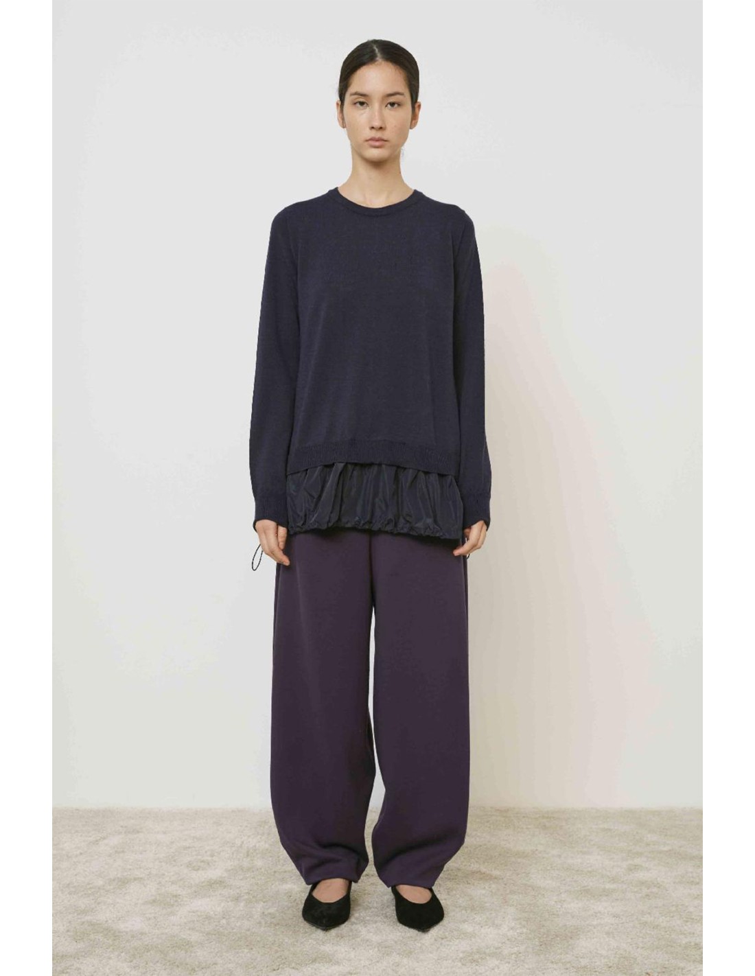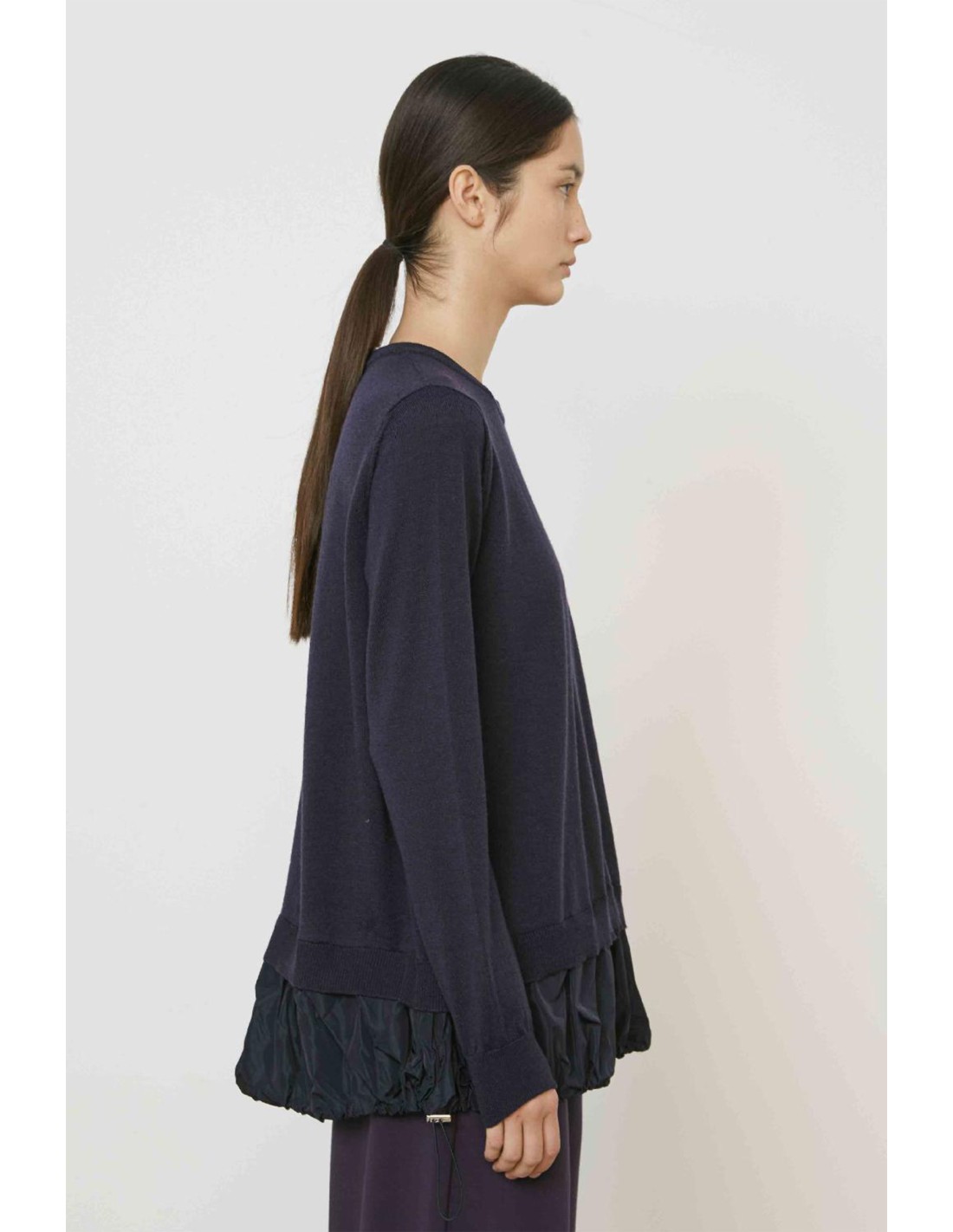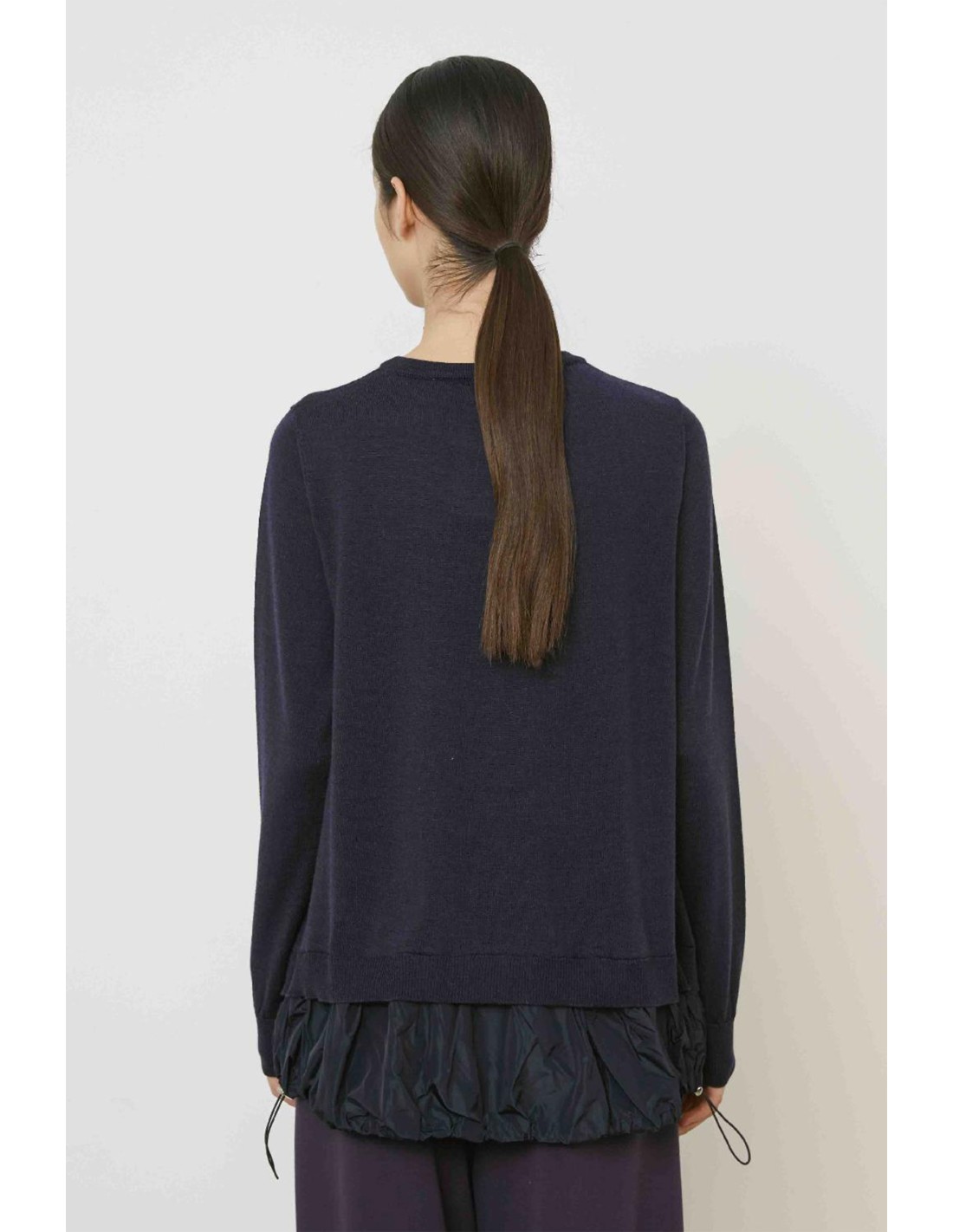 Jersey amplio de cuello redondo en lana virgen, bajos en tafeta con goma.