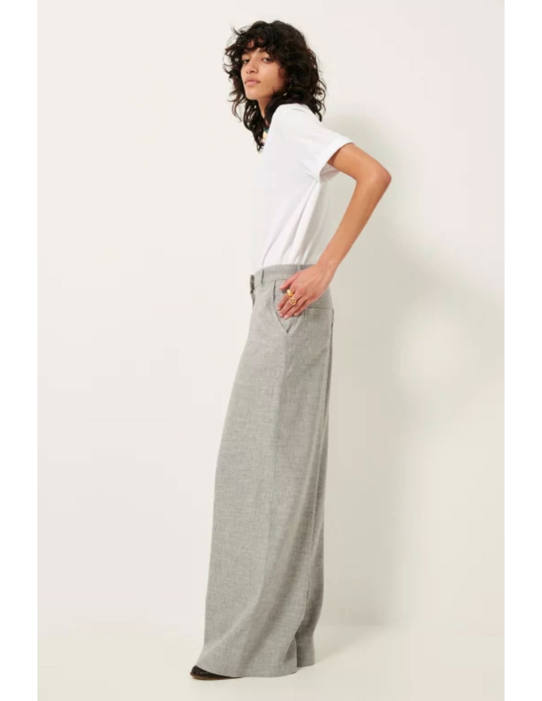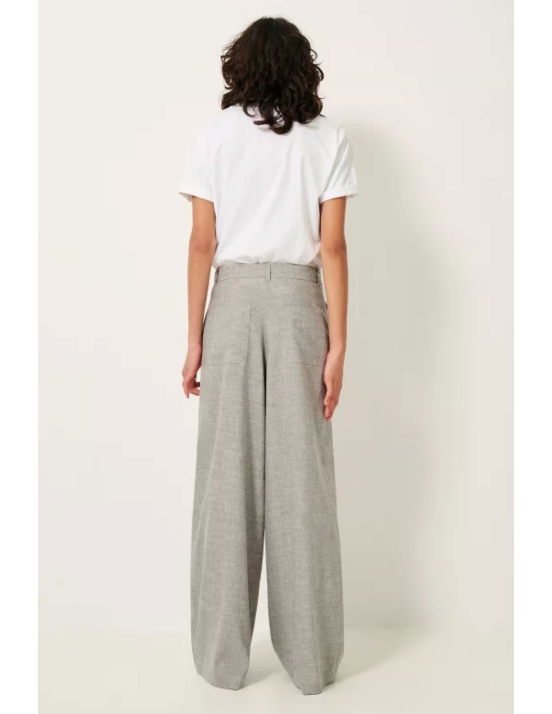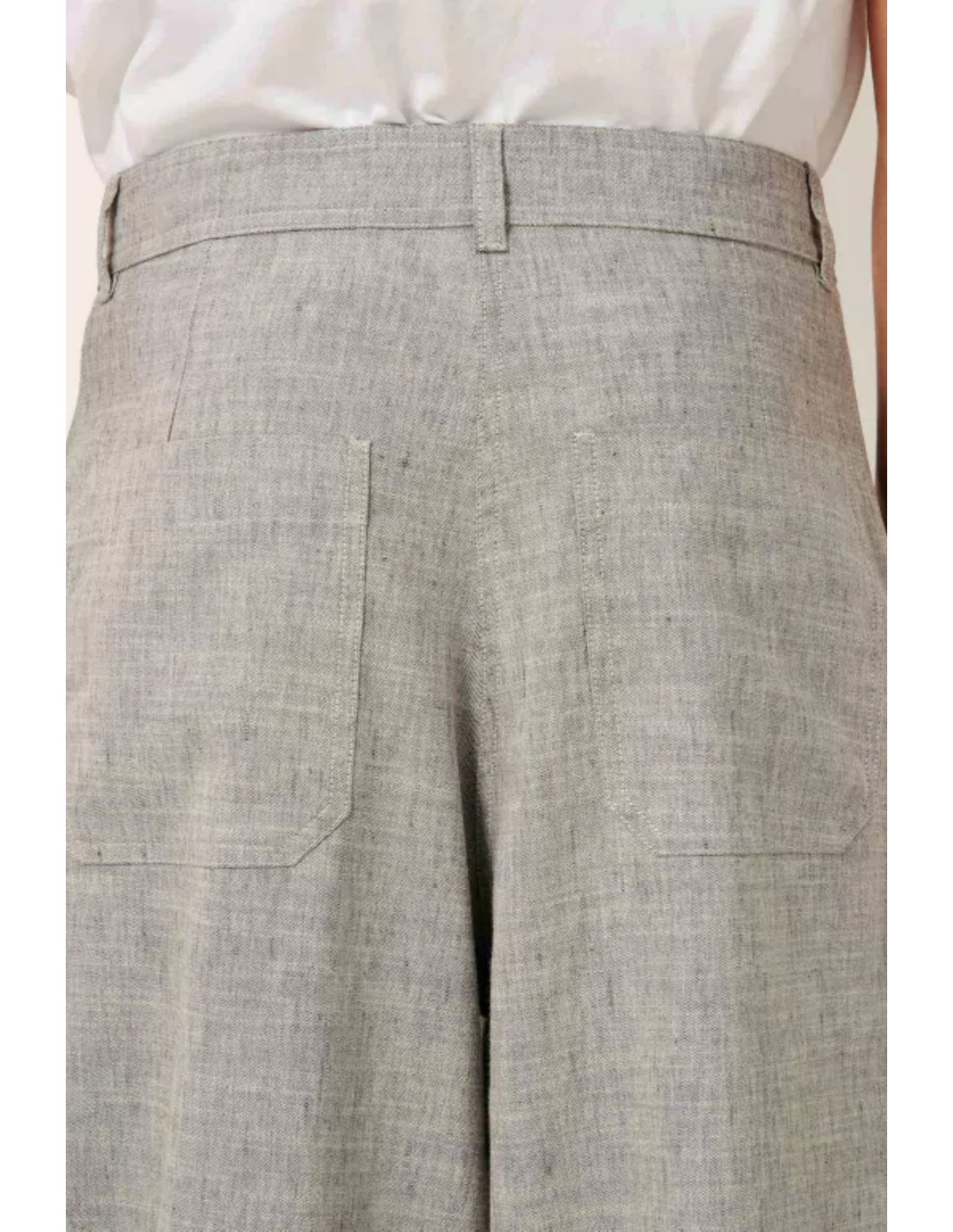 Pantalón en color tostado con hilos de lino moteados y torcidos teñidos, talle alto, cierre de botón y cremallera oculta.