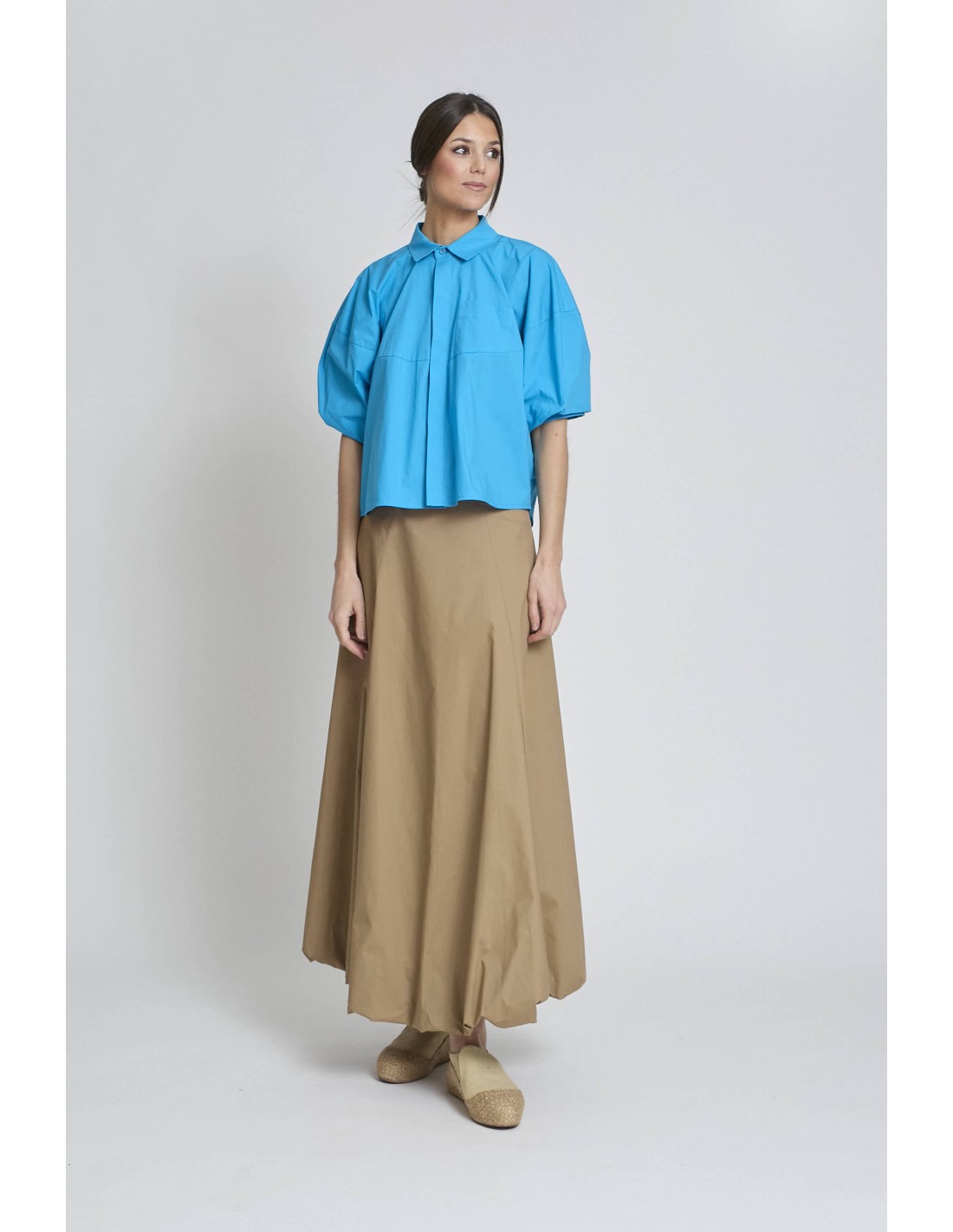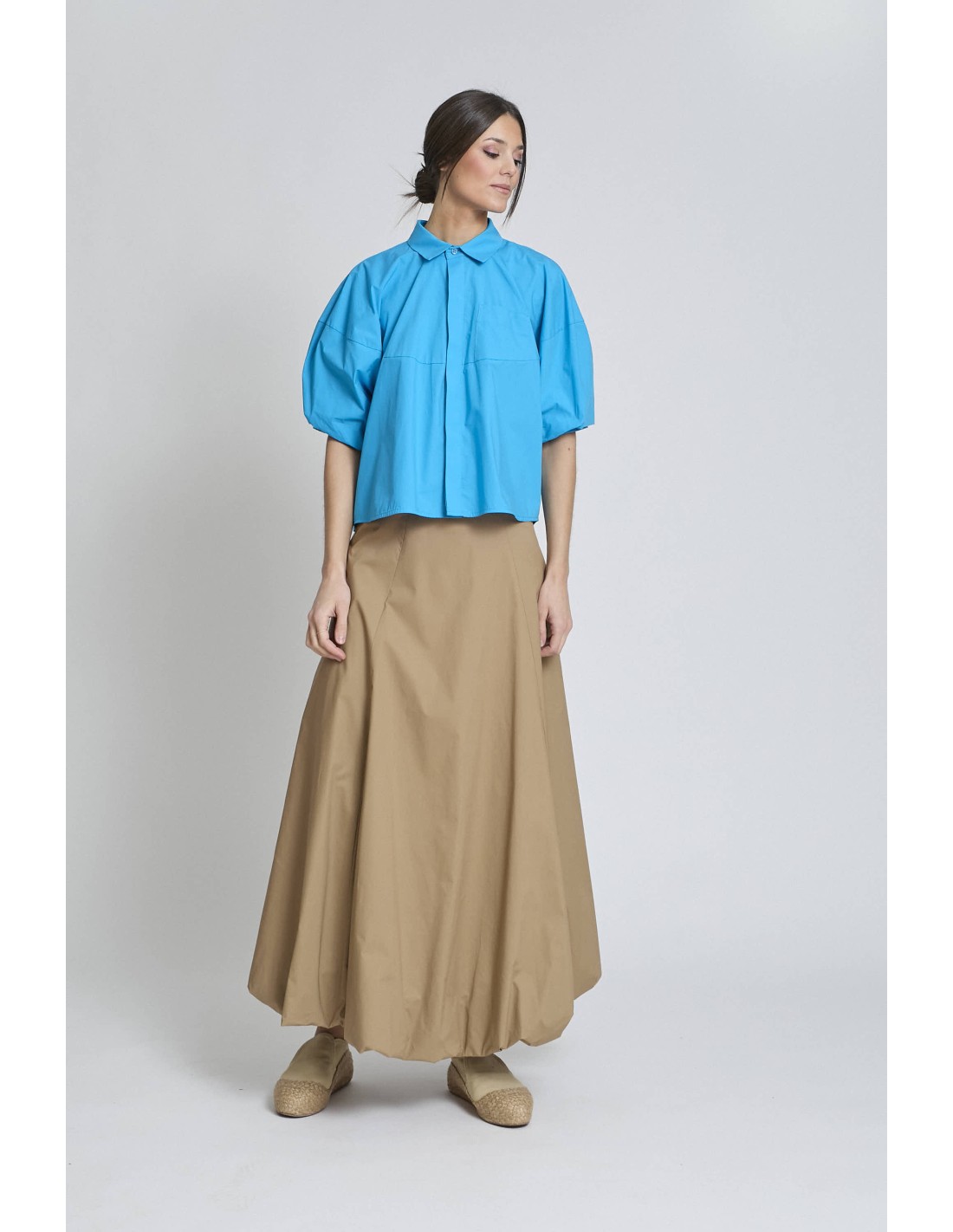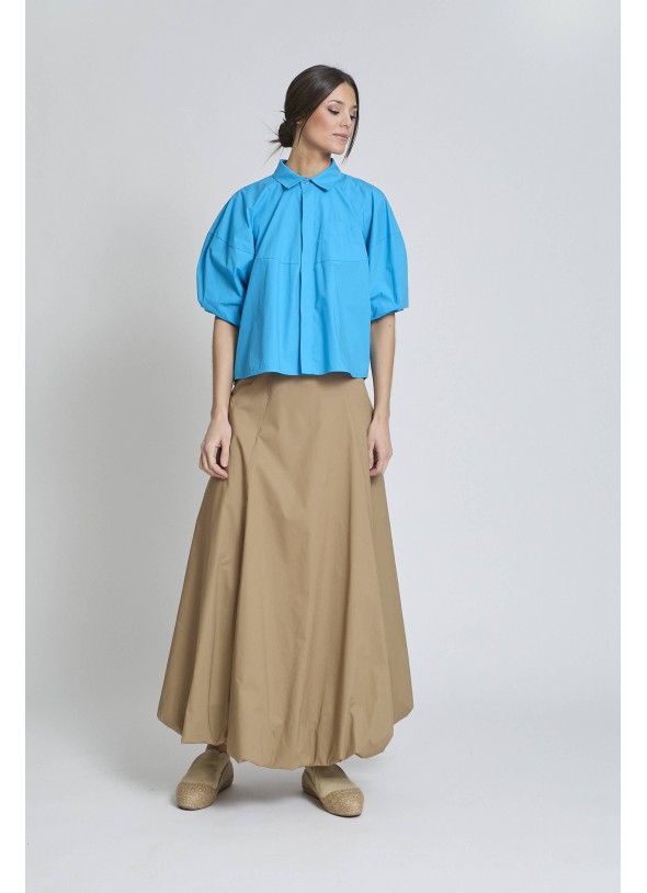 Camisa azul con botones delanteros, detalle bolsillo pequeño en delantera, manga abullonada, trasera con volumen.