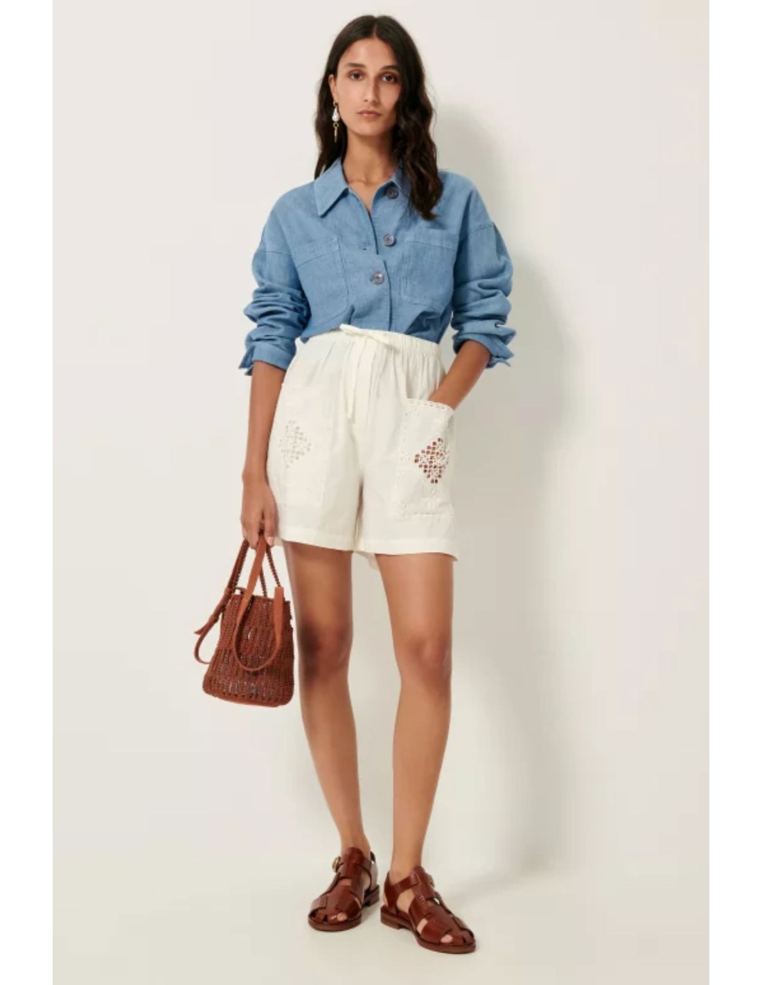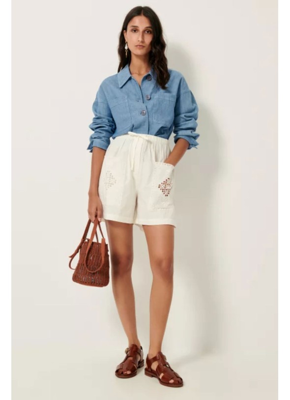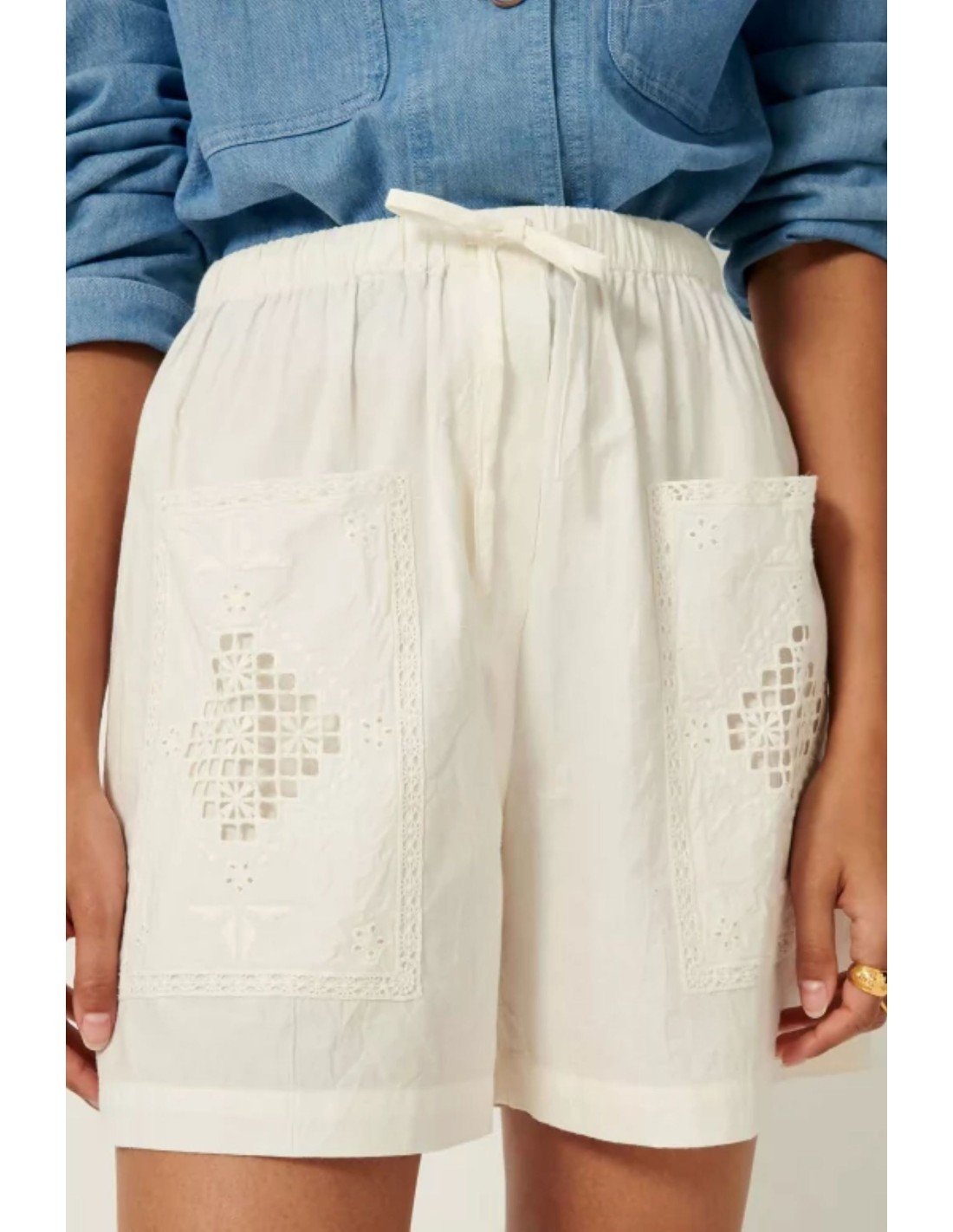 Short de cintura elástica con cordones anudables en la parte delantera, bolsillos grandes de parche con bordado calado en delantera