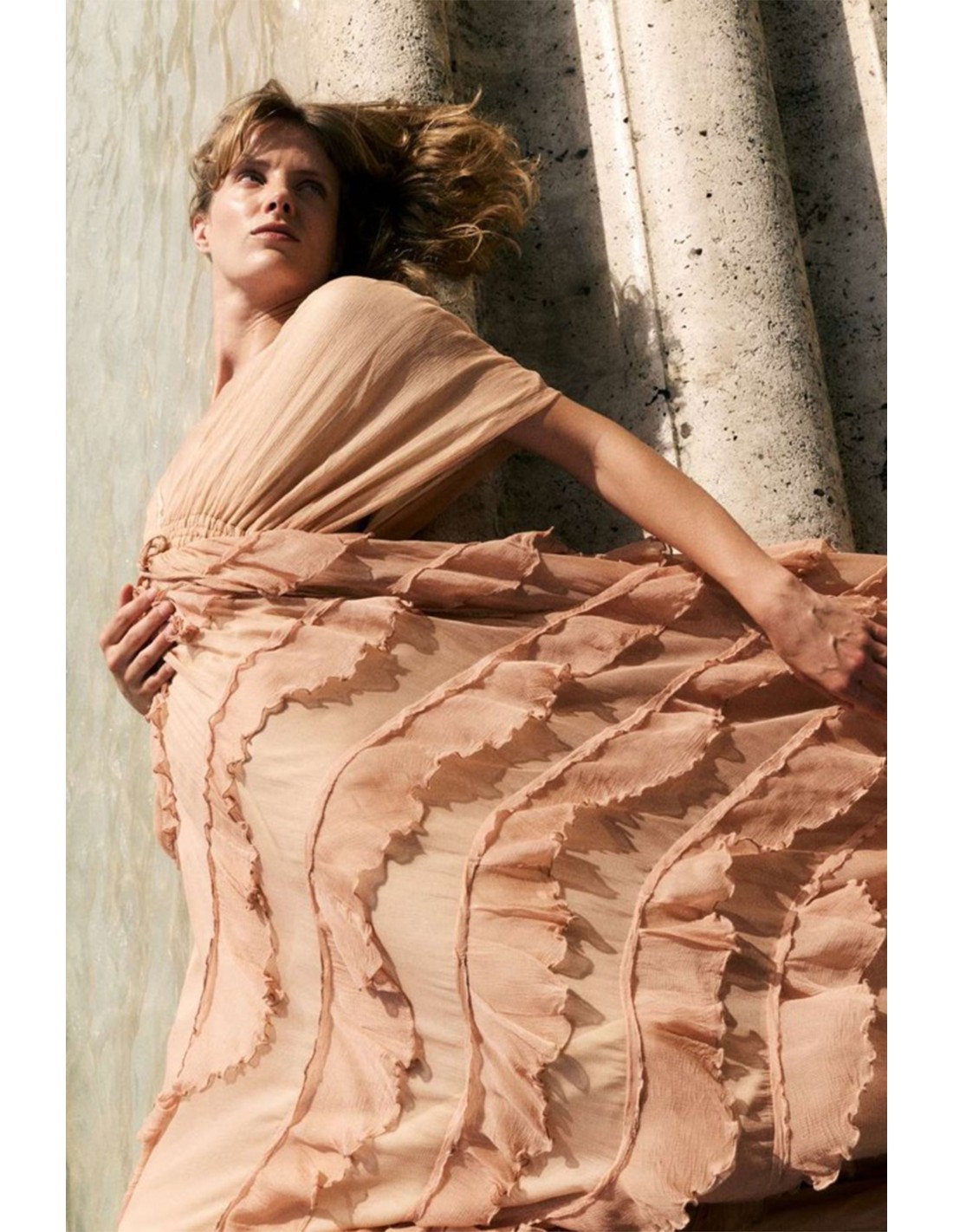 Vestido fluido de gasa de viscosa, realzado por un forro que crea un delicado contraste con los volantes, escote en V