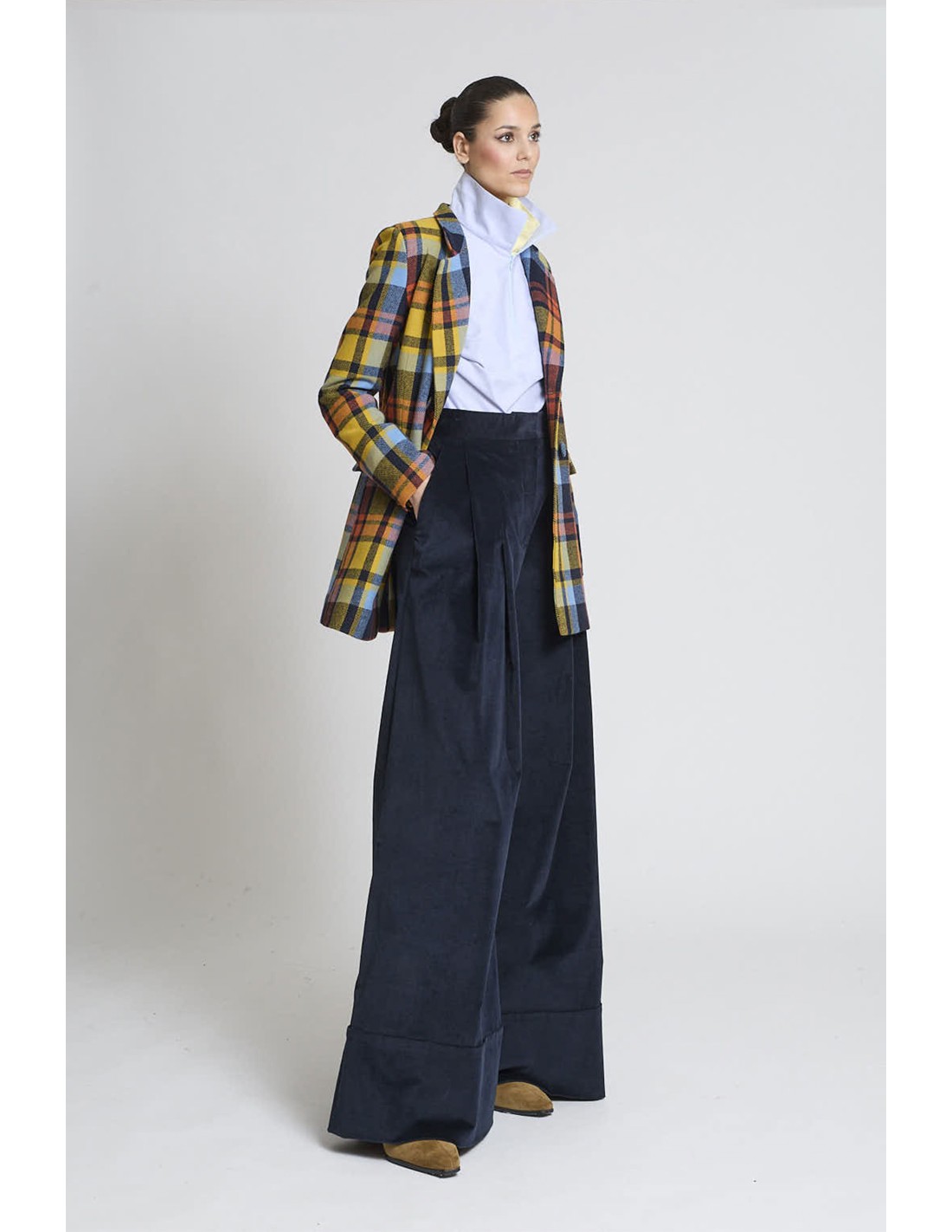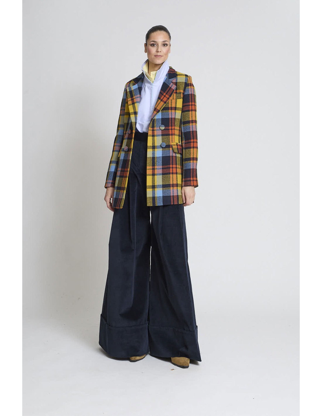 Americana cruzada en cuadro multicolor.